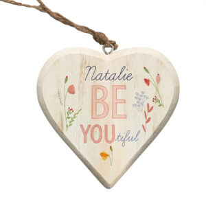 Personalise this lovely floral wooden hanging heart with their name using a maximum of 15 characters above the fixed text ‘Be You Tiful’. This painted white heart is complete with rope ready to hang and measures 15cm height (excluding rope) x 14cm width x 3cm depth.