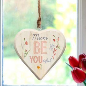 Personalise this lovely floral wooden hanging heart with their name using a maximum of 15 characters above the fixed text ‘Be You Tiful’. This painted white heart is complete with rope ready to hang and measures 15cm height (excluding rope) x 14cm width x 3cm depth.