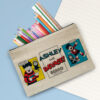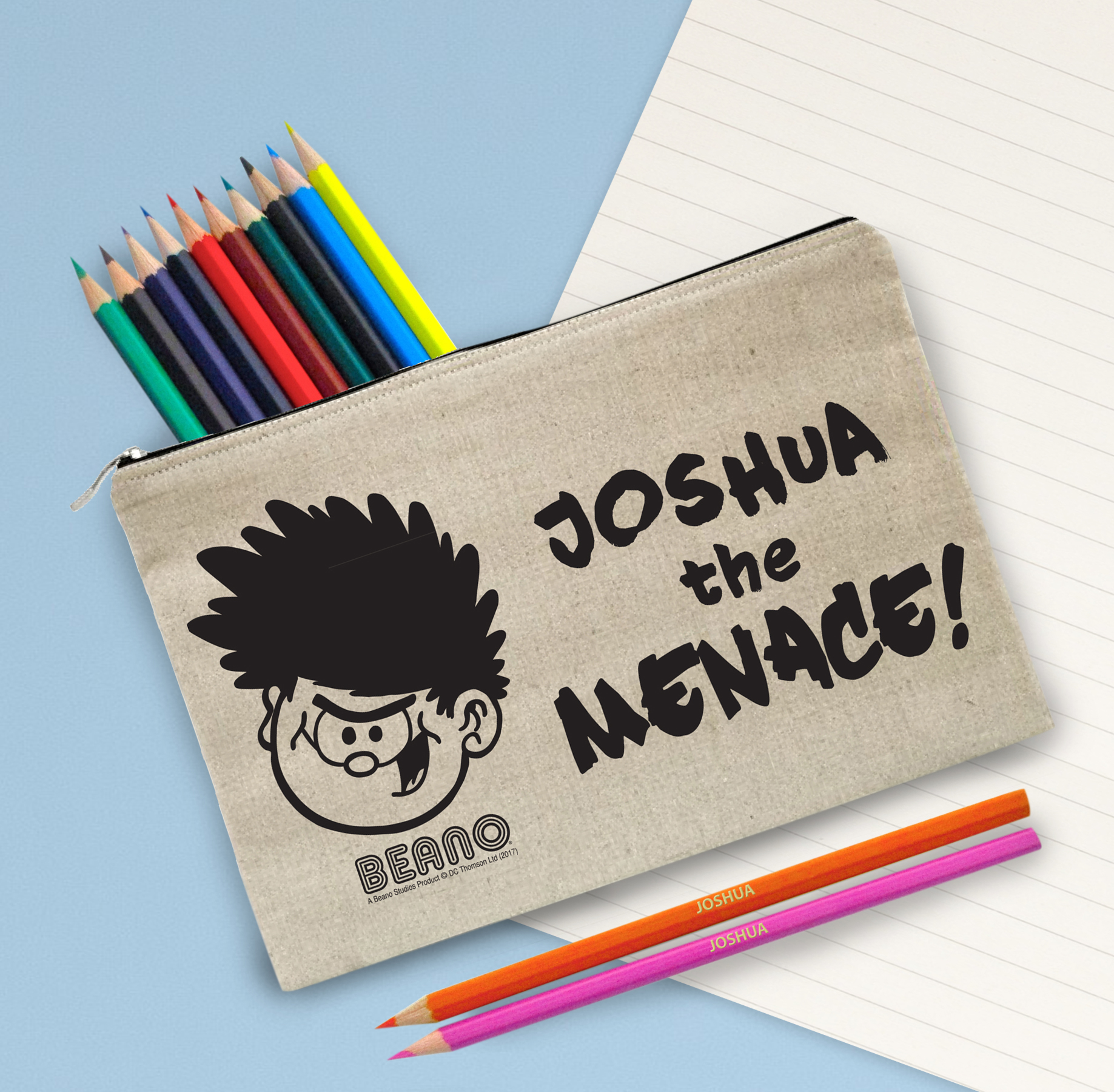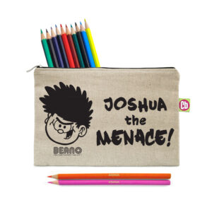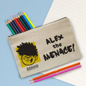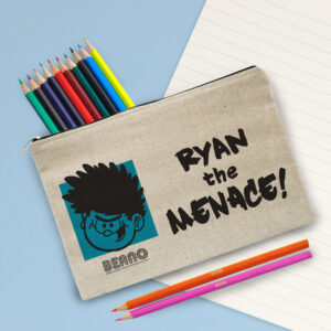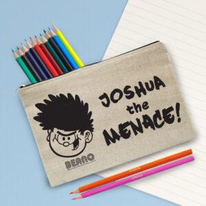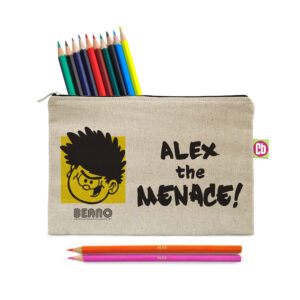 This pencil case is a natural light oatmeal colour with a padded inside. Simply choose your design and personalise with any name of up to 15 characters. The pencil case measures 25 cm wide by 16 cm high. Both the Pencil Case & 22 coloured pencils are personalised with any name
