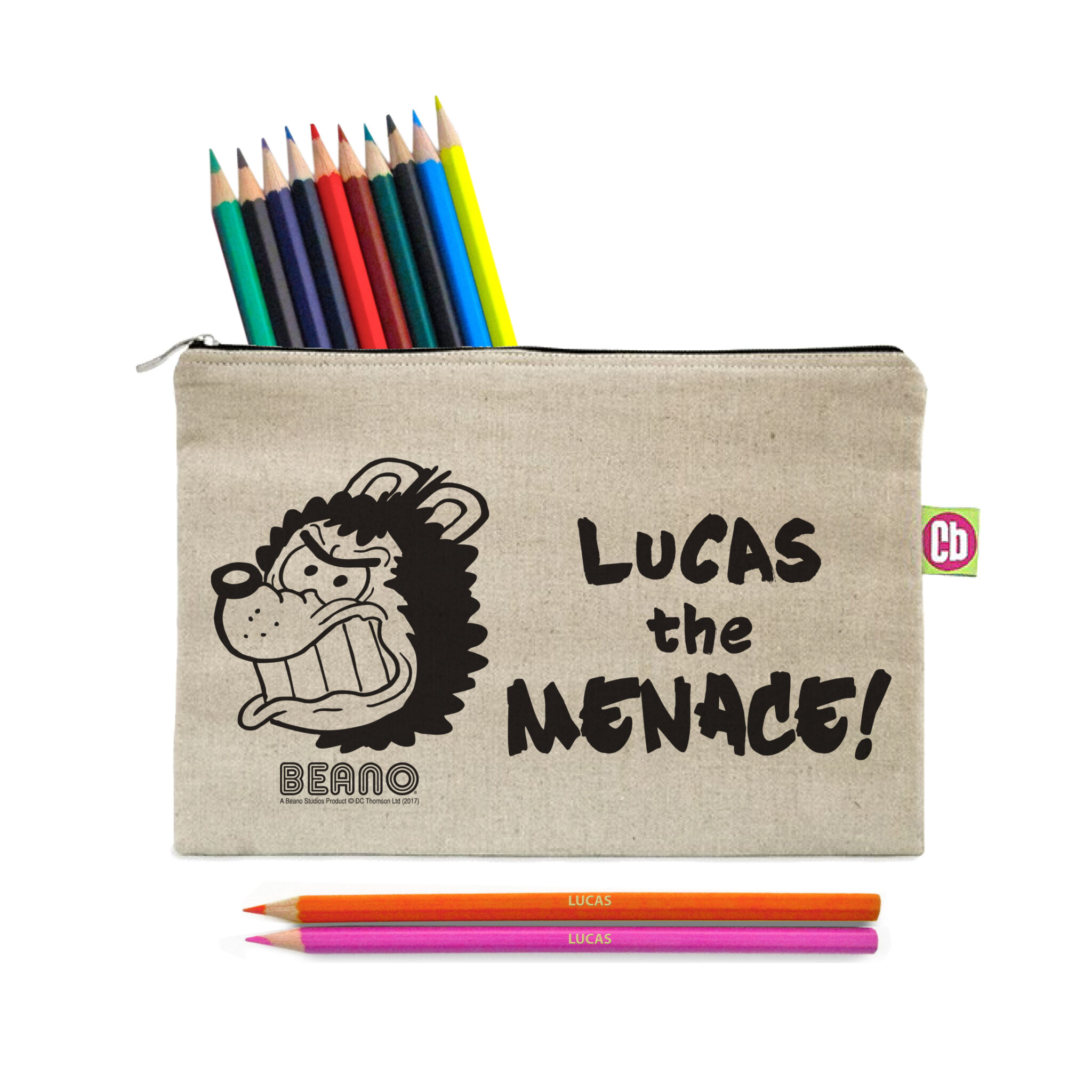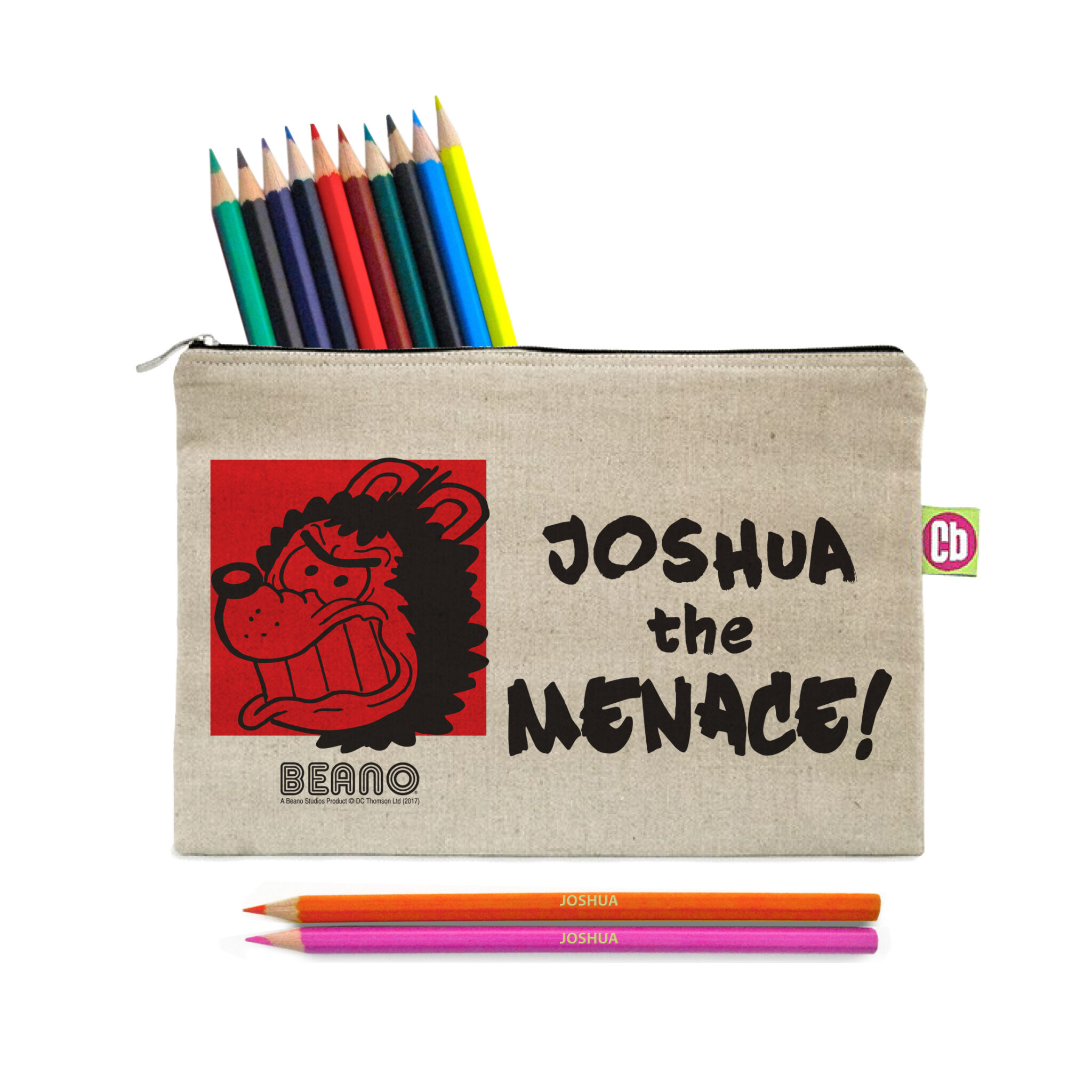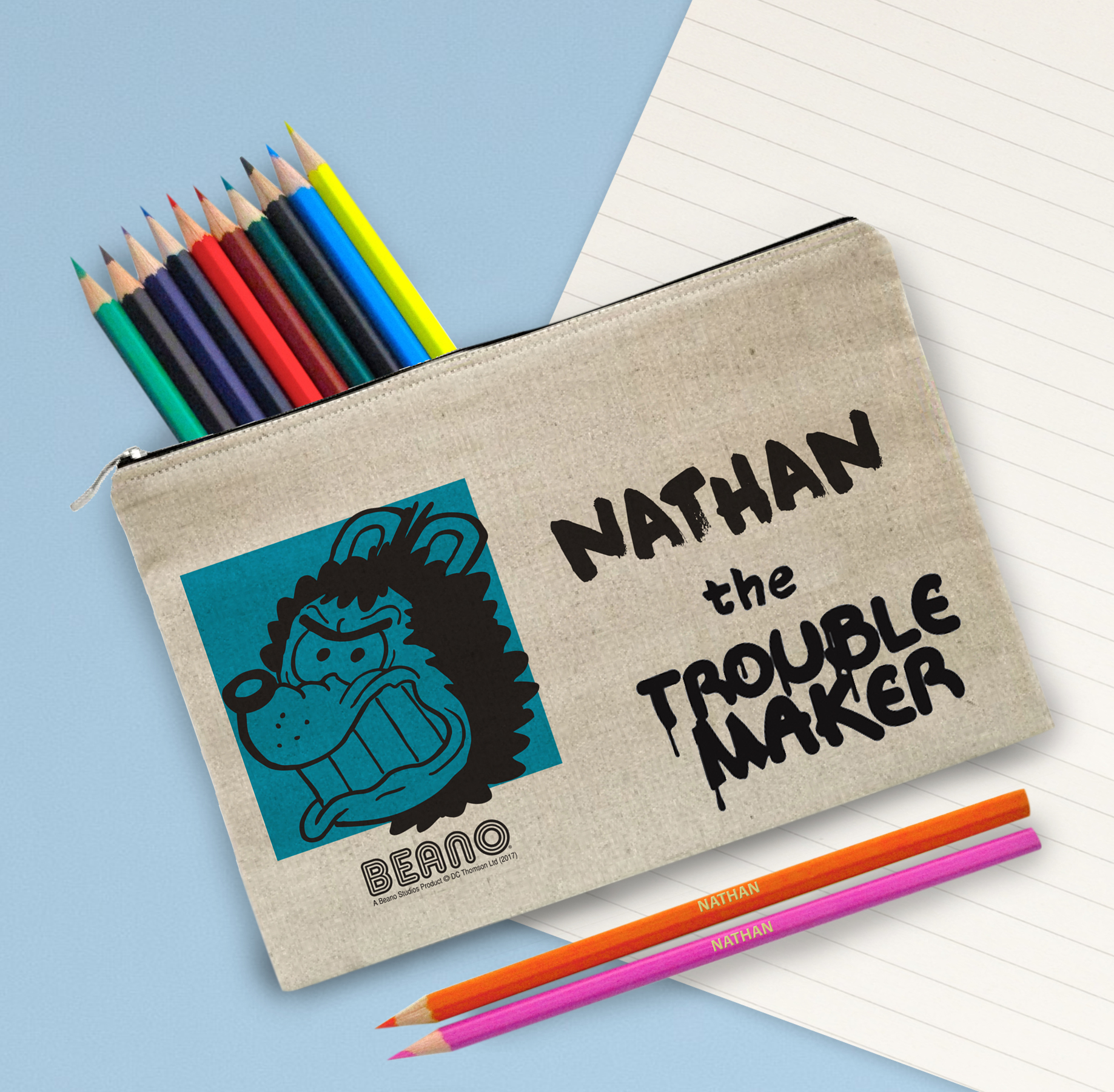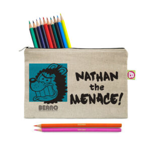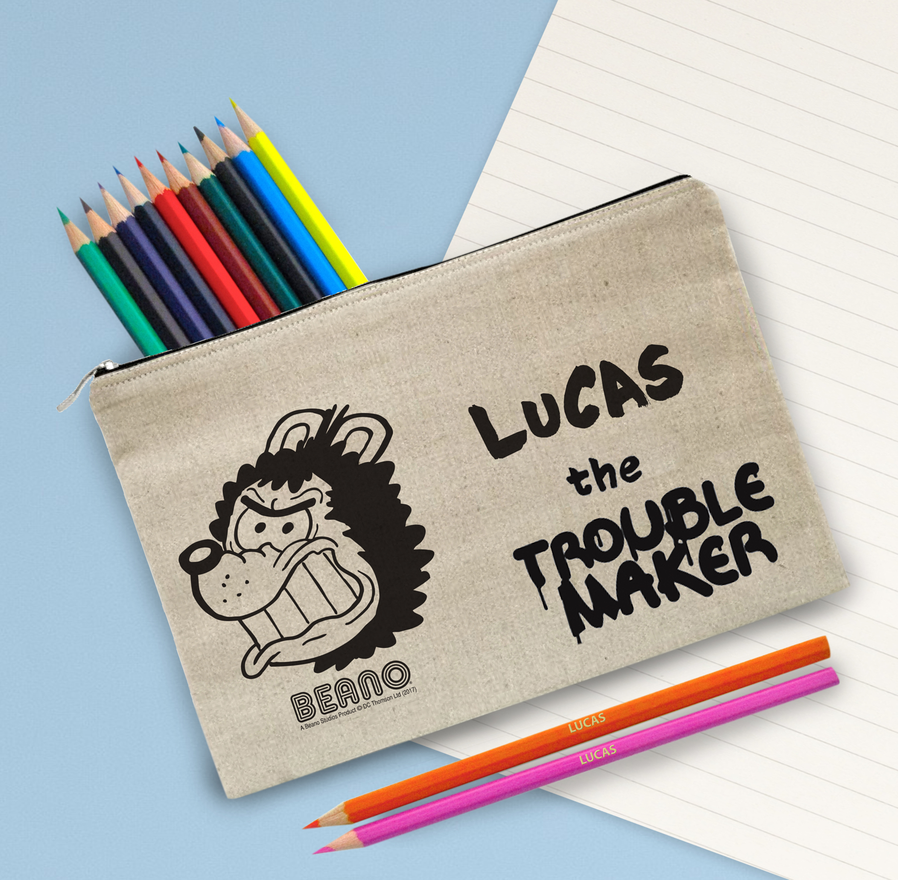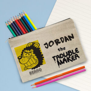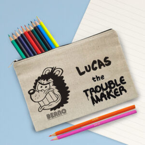 This pencil case is a natural light oatmeal colour with a padded inside. Simply choose your design and personalise with any name of up to 15 characters. The pencil case measures 25 cm wide by 16 cm high. Both the Pencil Case & 22 coloured pencils are personalised with any name