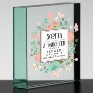 Personalise this beautiful jade glass block with a name of up to 15 characters and their title (15 characters). The quote reads ‘{Name} A {Title} is like a flower each one is beautiful & unique’. The lovely sentiment is written in a white square surrounded by delicate flowers making this the perfect gift for any occasion. The solid glass box comes in a presentation box and is 8cm high, 8 cm width and 2cm wide.
