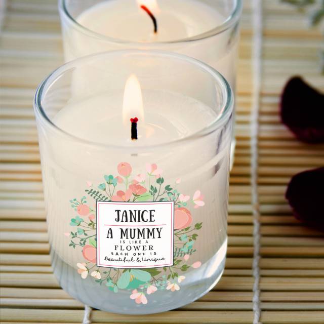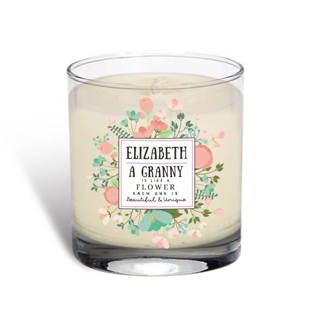 Personalise this rose scented glass candle with a name of up to 15 characters and their title (15 characters). The quote reads ‘{Name} A {Title} is like a flower each one is beautiful & unique’. The lovely sentiment is written in a white square surrounded by delicate flowers making this the perfect gift for any occasion. Dimensions: 8.5cm tall and 8cm diameter.