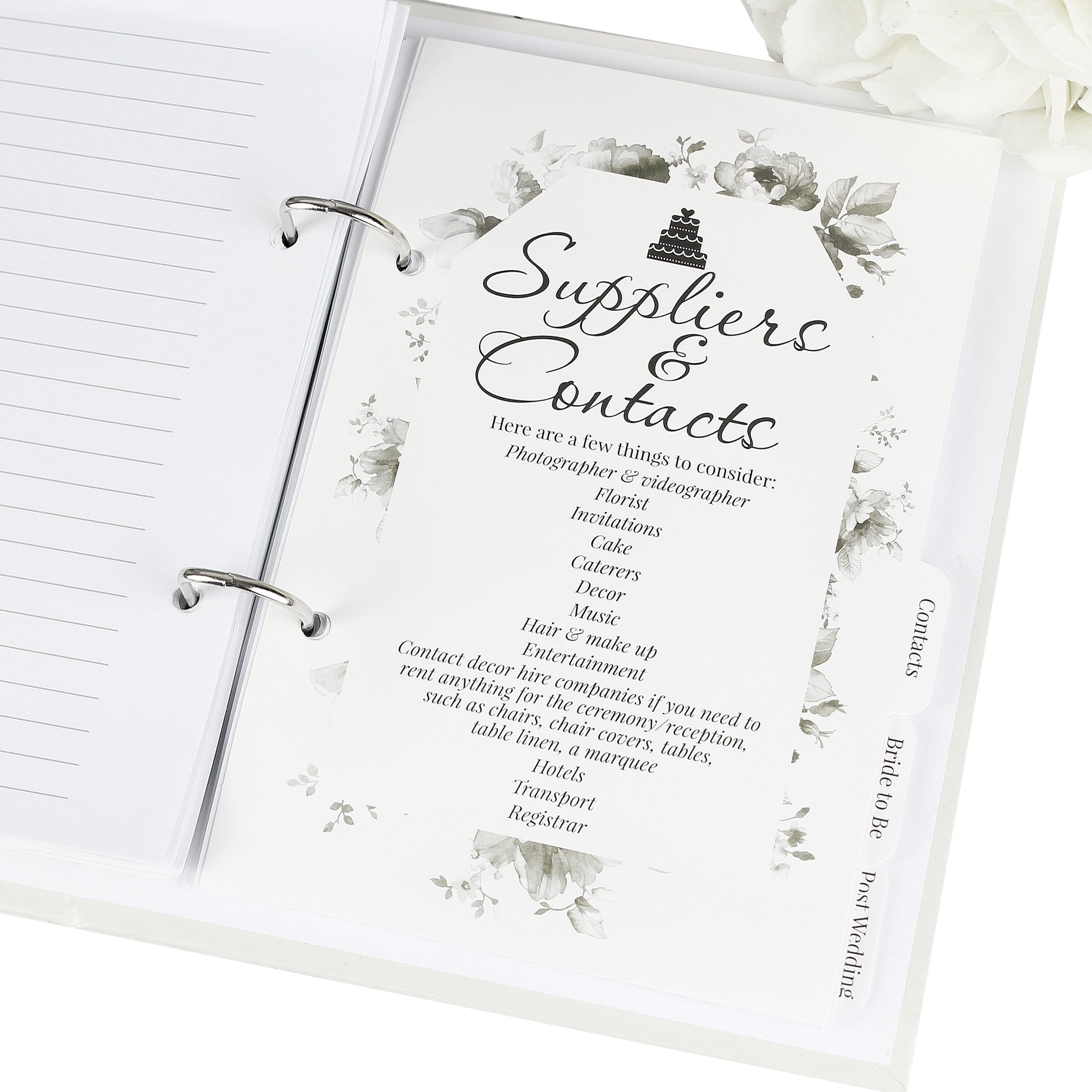 - This ring-bound wedding planner includes sections for the ceremony, stationery, contacts, Bride to be and post wedding.