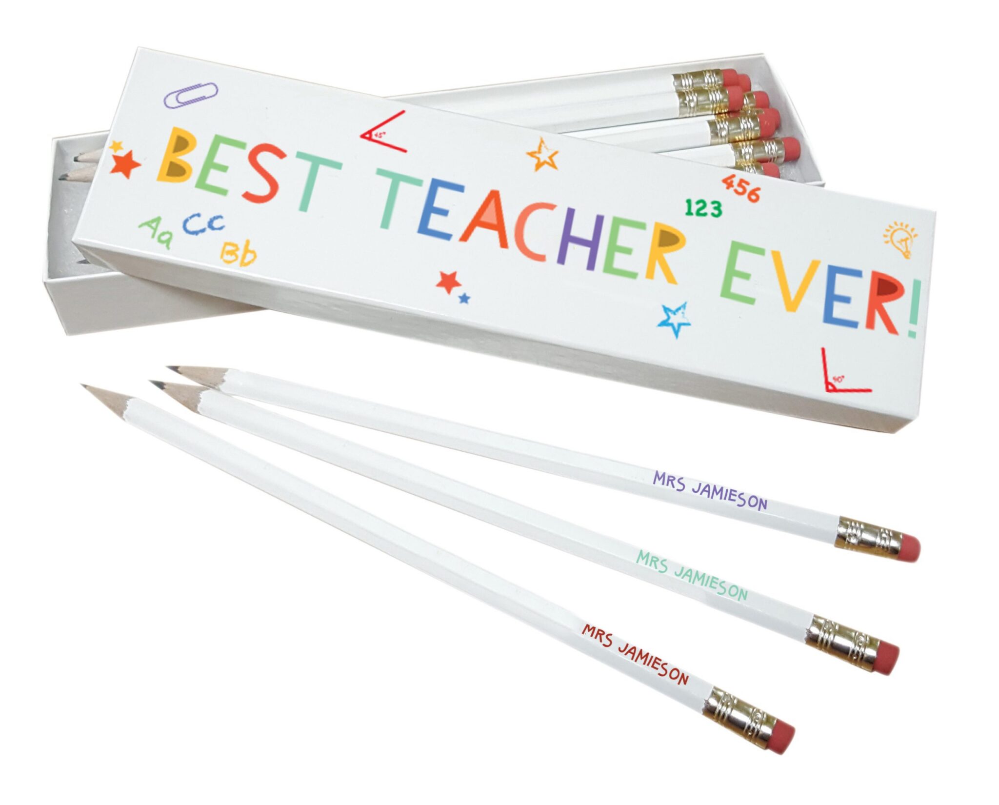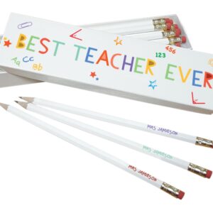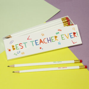 Looking for an end of term gift or a gift for Christmas? Look no further; this Best Teacher Ever themed pencil set will make any teacher smile. This pencil set contains twelve 19cm lead pencils all are printed with your name and are presented in 20.5 x 5.5 cm matching box personalised with any name up to 22 characters.