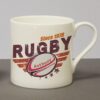 Personalise this rugby themed bone china mug with a year and a name of up to 15 characters. Dimensions: 9.5cm tall, 12cm width (Inc. handle) and 8.5cm depth. Microwave and dishwasher safe.