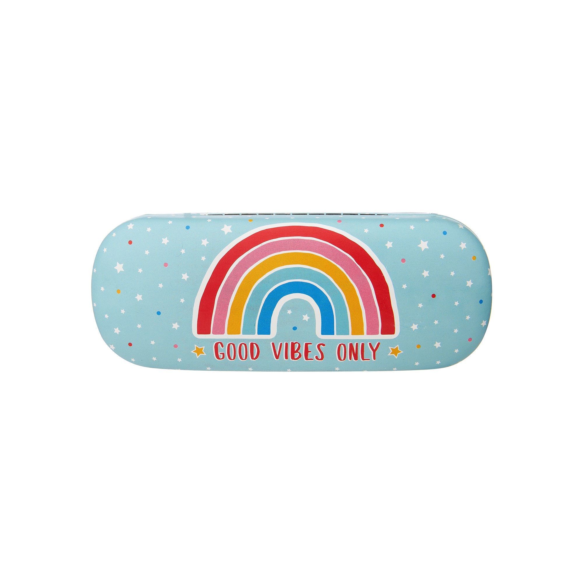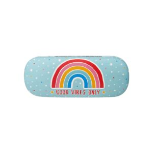 Store specs safely in this wonderful glasses case. In a shade of uplifting sky blue with our feel-good Chasing Rainbow design, a scattering of stars and the quote ‘good vibes only’. Includes a cleaning cloth.