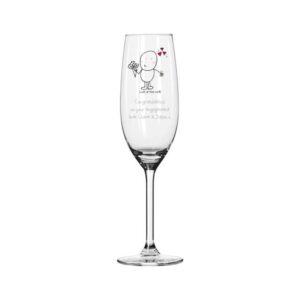 Look at that rock! A perfect compliment for a newly engaged couple is now included on a bespoke champagne flute along with our cute Chilli and Bubble character. Adorned with flowers and love hearts, this cute cartoon is the perfect way to mark a special engagement, whether you’re a well wisher or the prosper looking for a unique way to ask. Teamed with a bottle of bubbly, or presented on its own, this flute is an elegant keepsake of the special event. To add to the gift we also expertly engrave your loving message directly onto the highly polished surface.