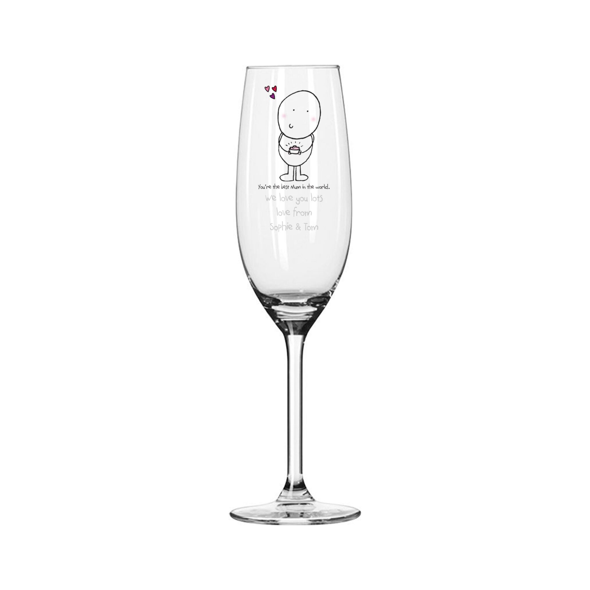 Toast to your lovely Mum with this colourful glass made just for her! Your special Mother’s Day message is lovingly engraved onto the front of the flute beneath our cute Chilli and Bubbles character. Let Mum know how much you appreciate everything she does with a gift she can cherish long after Mother’s Day is over.