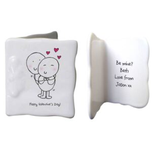 Looking for a Valentine’s Day card that lasts longer than the average? Give this unique bone china one instead! Our Chilli and Bubbles couple adorns the front of this mini message card, and your sentiment is expertly printed onto the inside, making this a lasting keepsake that will long outlive the day itself.
