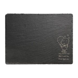 Do you need a cheesy Valentines gift with a difference? Poems and lovey-dovey verses are very traditional for 14th February gifts but with this beautiful slate you can out-cheese any gift you’ve previously given. Heartfelt and practical this wooden chopping board has plenty of room for chopping and features our loving Chilli and Bubbles characters having a cuddle in the corner of the board. We also include your own message for your beloved making this a perfectly personalised cheesy Valentines gift.