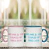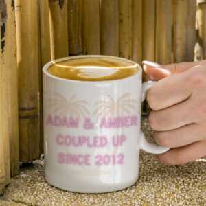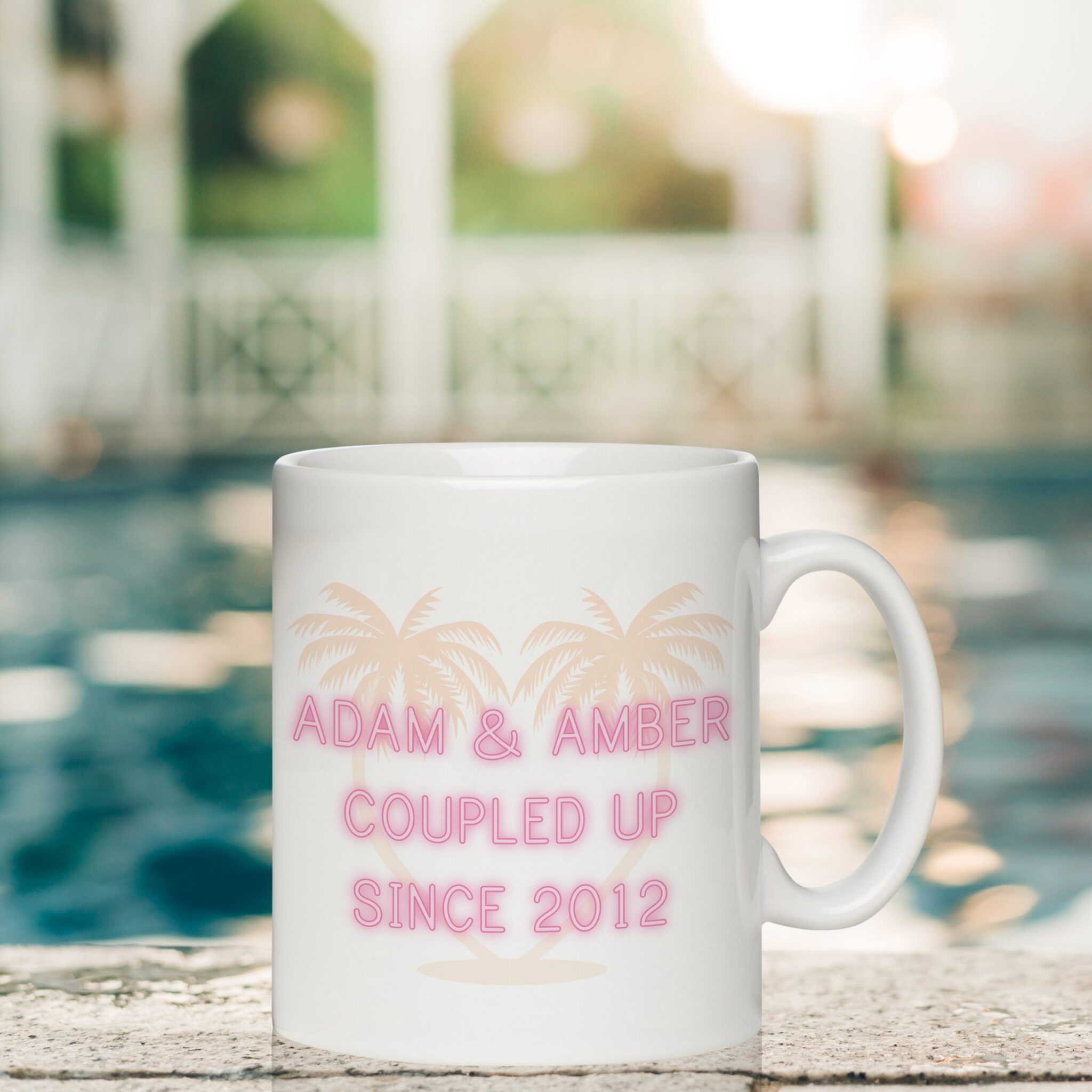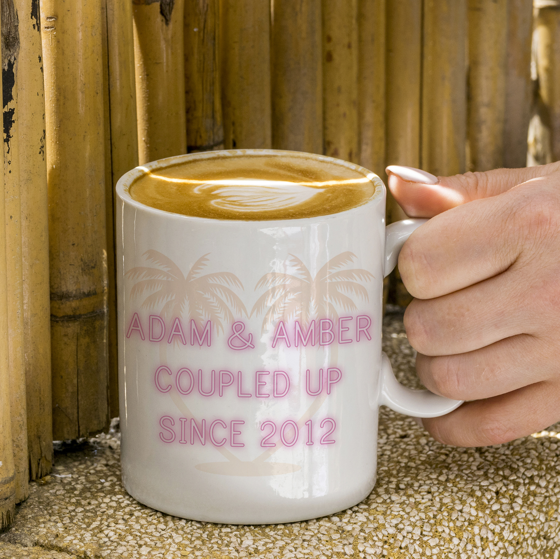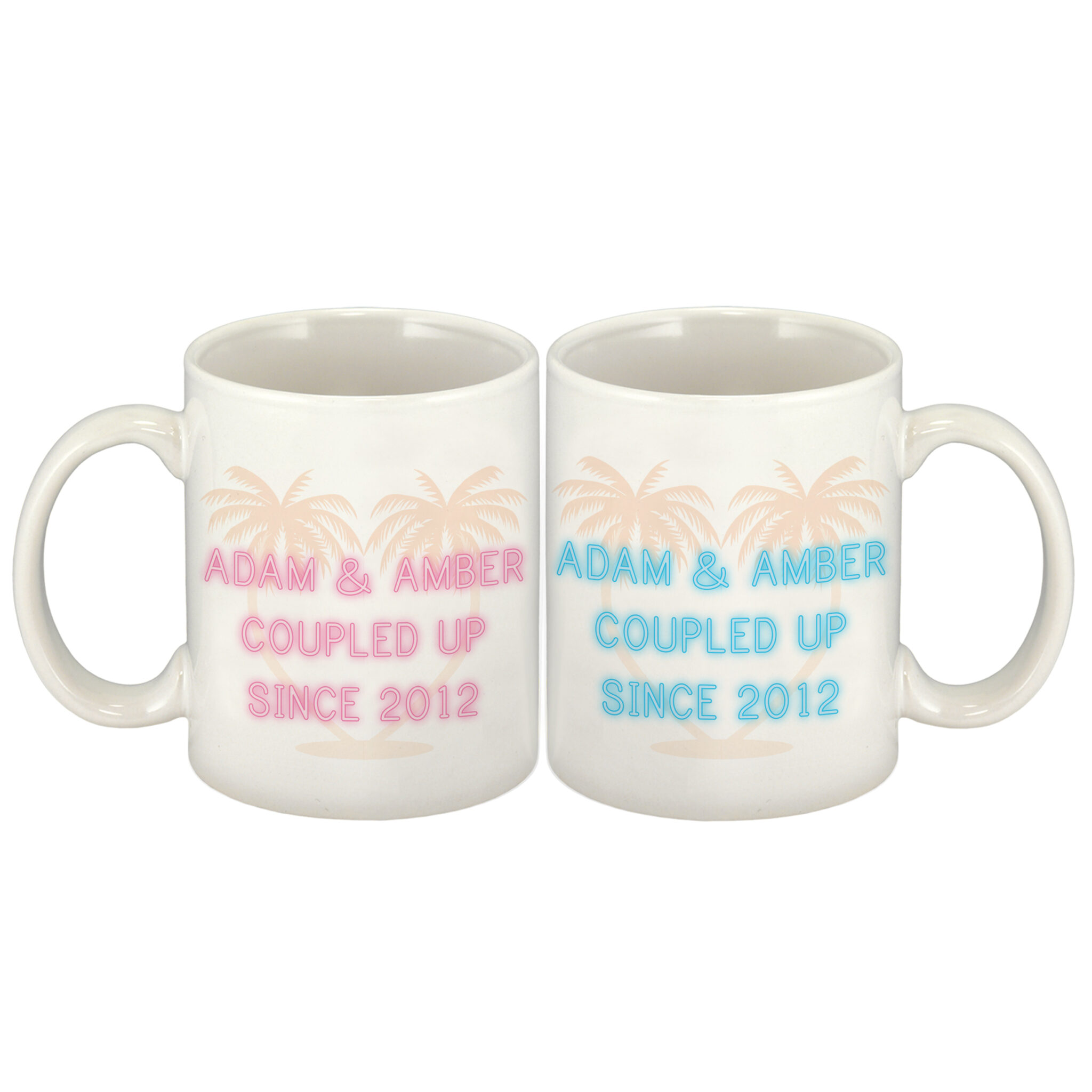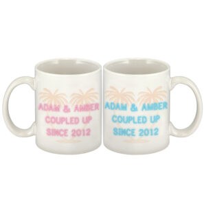 This mug set makes the perfect gift for couples. Each mug is personalised with 2 names of 15 characters and a year which will appear before and after the fixed text ?coupled up since?. The design will appear front and back and the personalisation will always be in capitals. We recommend hand wash only and the 11oz ceramic mug is not microwave safe.
