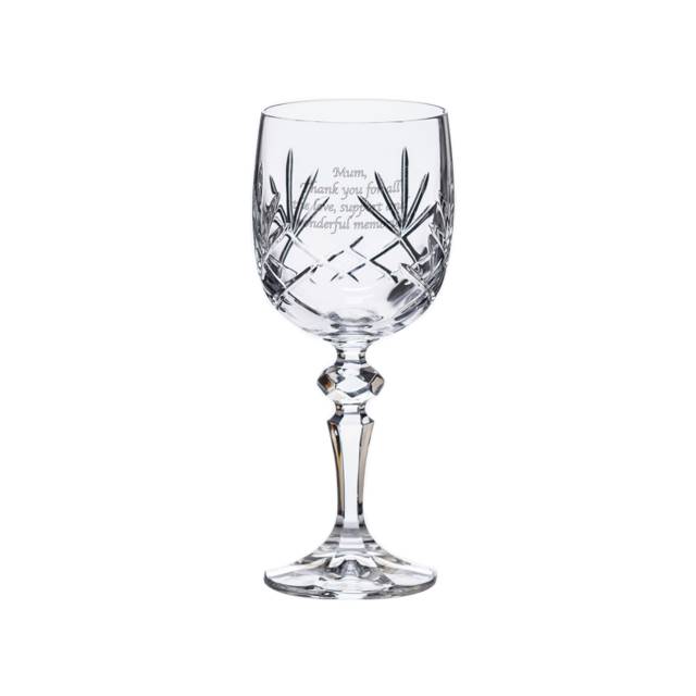 Need a gift for a wine lover? Look no further! This cut crystal glass is fitting for any celebration, and with your message engraved on the front it makes a personal gift that can be used and cherished long after the event is over.