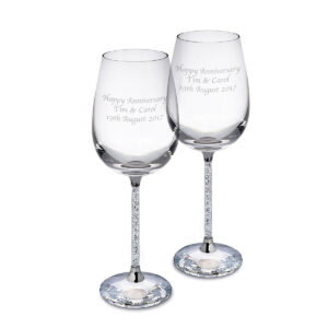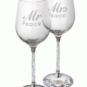 These gorgeous wine glasses make the perfect gift for any special occasion. We will engrave your unique message over 3 lines of 25 characters including spaces on both glasses. The stem is filled with crystals and presented in a black gift box. Each glass is 24cm tall and 7cm diameter.
