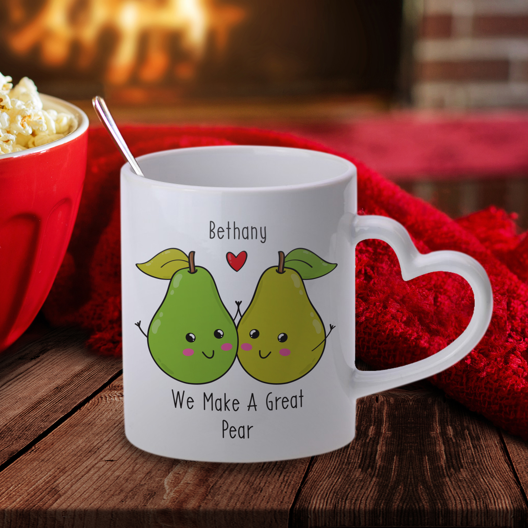 Add a name of up to 15 characters to this pun-tastic mug! The 11oz white ceramic mug is 9cm tall, 11cm wide (including heart shaped handle) and 8cm diameter. We recommend hand wash only.