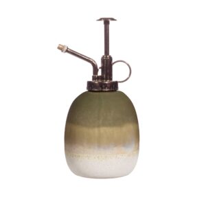This tonal green indoor plant mister is complete with a metallic silver spout and pump mechanism. The rustic texture and dip ombre effect are created from the reactive glaze which forms subtle variations in colour tones, making each one beautifully unique. Completed with a gloss finish.