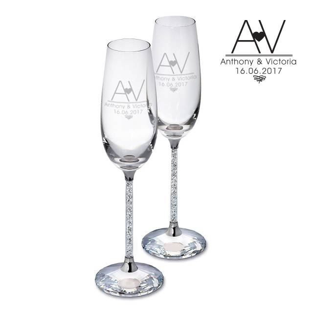 These gorgeous flutes make the perfect gift for any special occasion. We will engrave your unique message over 2 lines of 25 characters including spaces on both glasses below your selected 2 initials which will feature either side of a heart. The stem is filled with crystals and presented in a black gift box. Each glass is 24cm tall and 6cm diameter.