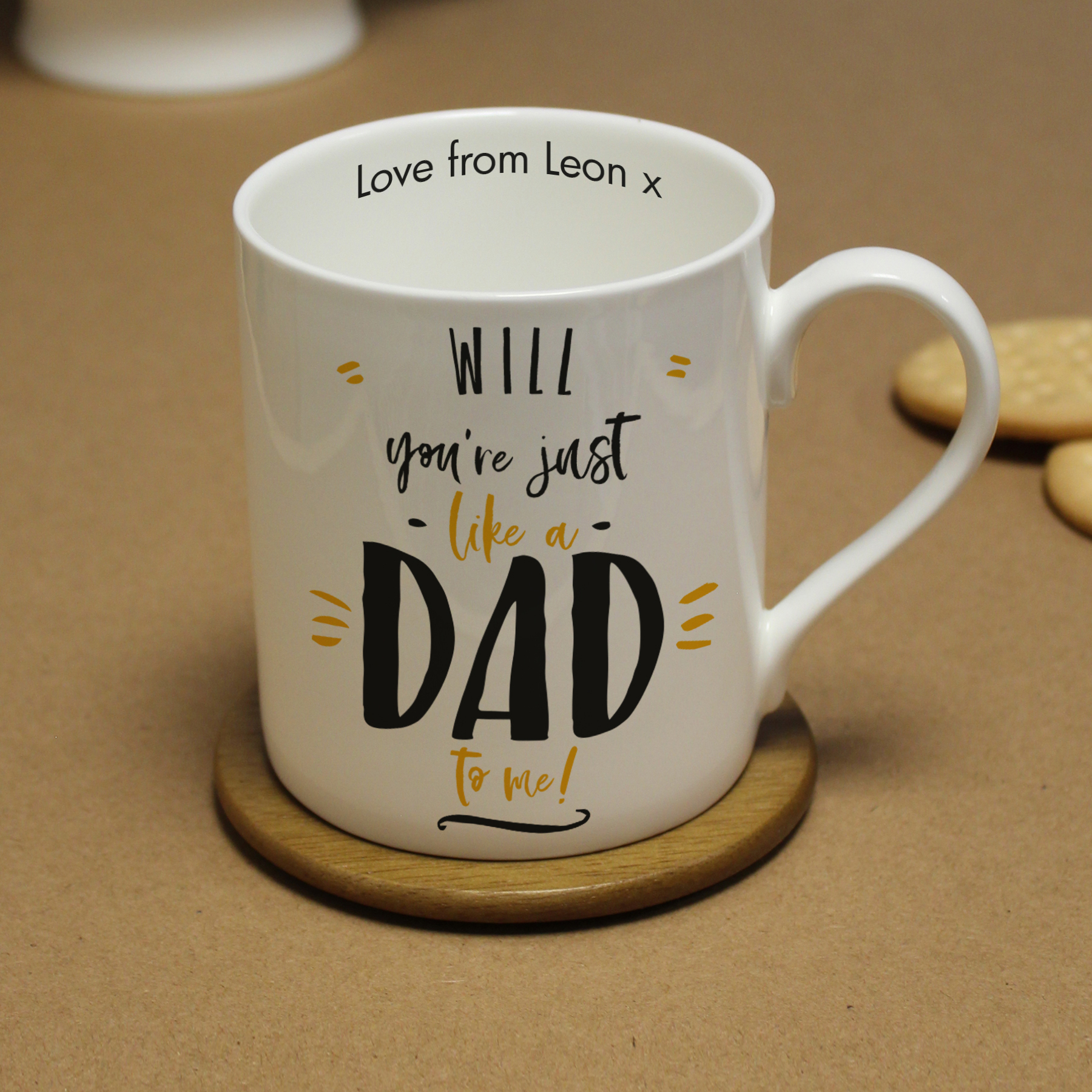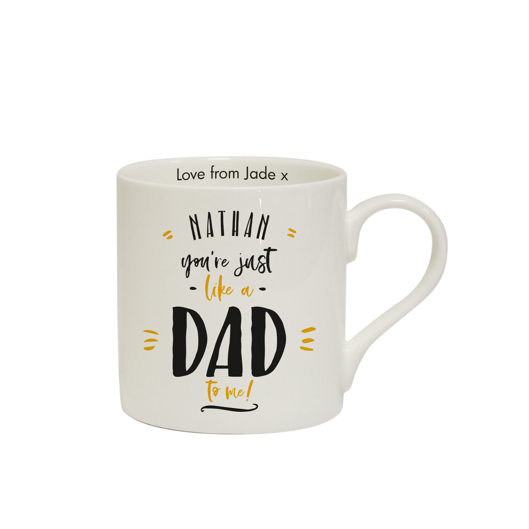 Treat someone who is just like a dad to you with this bone china large balmoral mug. Personalise the mug on the inside lip with a special message of up to 20 characters. Add their name using 15 characters above the fixed quote ‘you’re just like a dad to me’. Dimensions: 9.5cm tall, 12cm width (Inc. handle) and 8.5cm depth. Microwave and dishwasher safe.