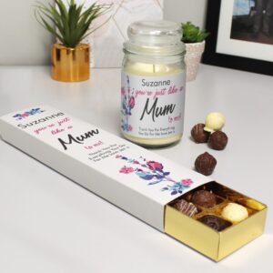 Looking for a gift that say Happy Mother’s Day to a person that is just like a Mum to you? Then look no further! This set of personalised luxury truffles and personalised Candle Jar jar is sure to hit the mark. The beautifully smooth and rich chocolate truffles are perfectly paired with the French vanilla scented Candle Jar. The labels of these beautiful gifts are adorned with the recipient’s name and a message from you, making this a first-class gift they won’t soon forget! Please Note – ‘You’re Just Like A Mum To Me!’ is fixed Text.