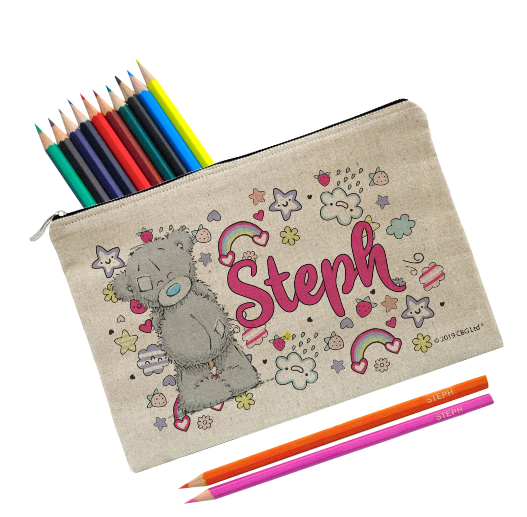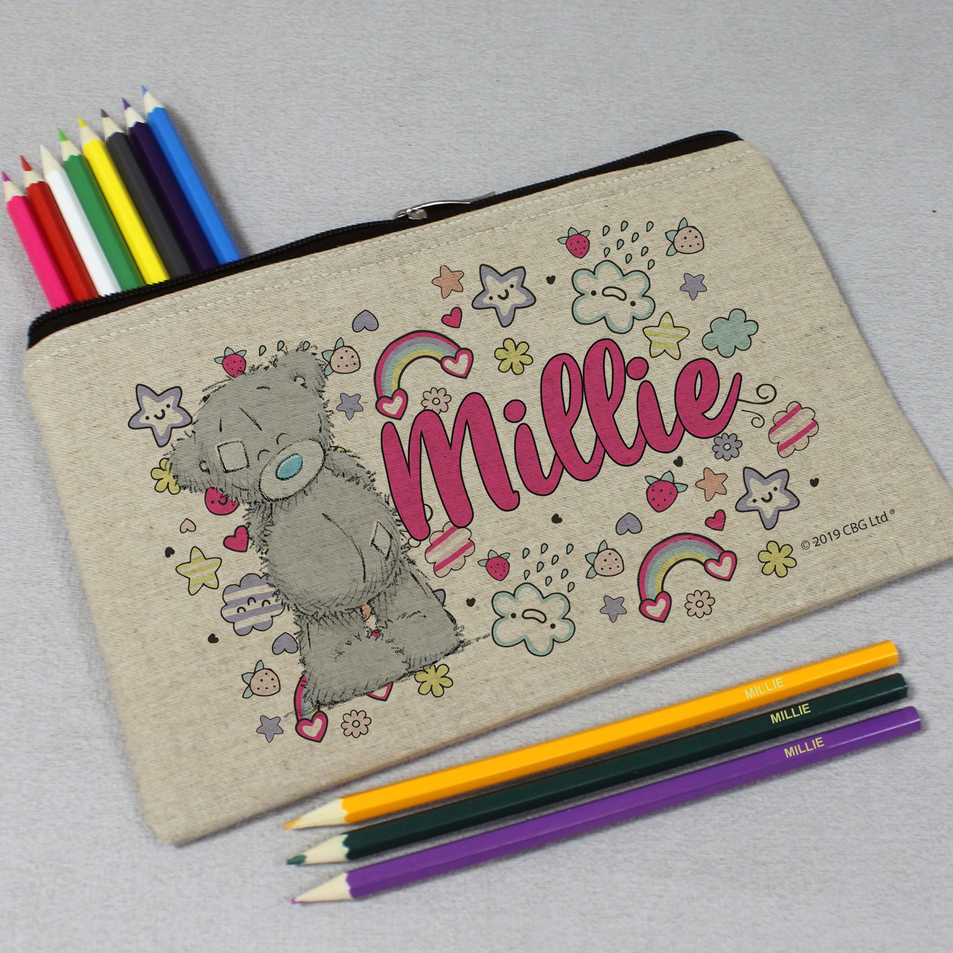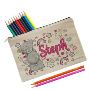 Featuring Tatty Teddy surrounded by a cute doodle design this pencil case is sure to make them smile. Personalised with a name up to 15 characters. This pencil case is a natural light oatmeal colour with a padded inside. The pencil case measures 25 cm wide by 16 cm high. Both the Pencil Case & 22 coloured pencils are personalised with any name