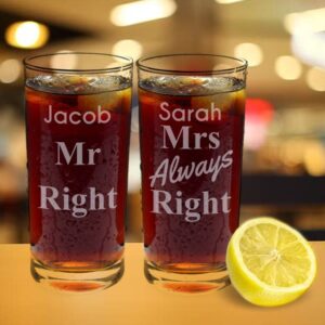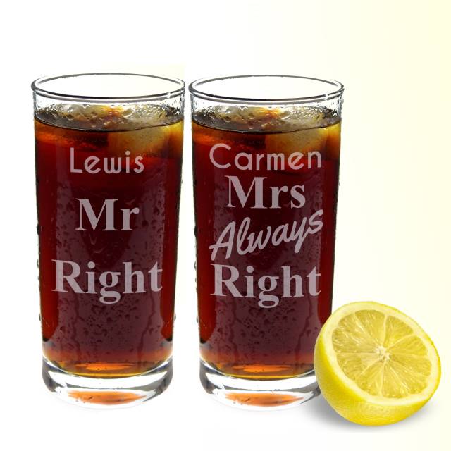 Personalise this quirky set of hi ball glasses with two names of up to 15 characters. Name 1 will appear above the fixed quote ?Mr Right? and Name 2 will appear above the fixed quote ?Mrs Always Right?. Dimensions for each glass are: H: 13cm x W: 6cm x D: 6cm. Dishwasher safe.