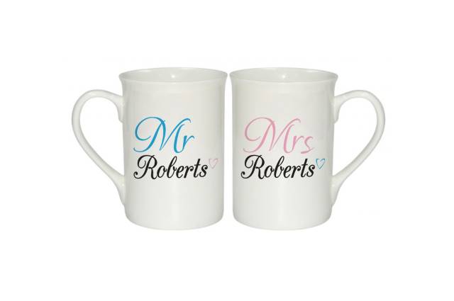 Perfect for a wedding or anniversary present, this matching pair were made for each other. Personalised his ‘n’ hers mugs include the couple’s surname onto the simple, single heart design. Mr’s mug is in black writing, and Mrs’s is pink, but each mug includes a heart of the opposite colour meaning the other half is still in mind. Whether kept together at home or taken to separate places of work, these two will never truly be separate – much like the lovely couple!