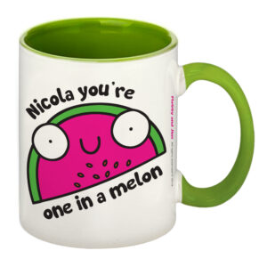 Add a name of up to 15 characters to this pun-tastic mug! Your chosen name will feature before the fixed quote ?you?re one in a melon?. The 11oz green inside mug is 9cm tall, 11cm wide (including handle) and 8cm diameter. We recommend hand wash only.