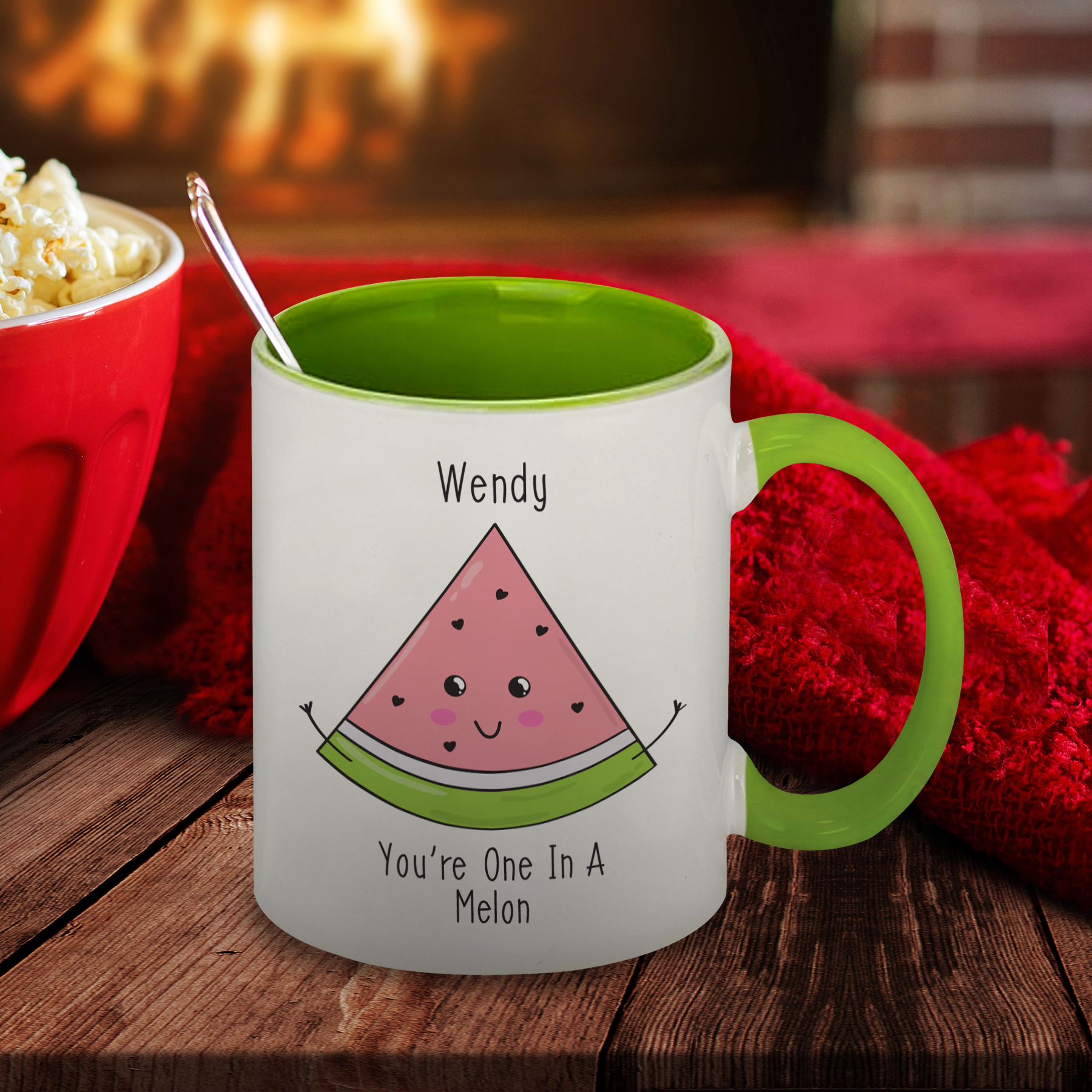 Add a name of up to 15 characters to this pun-tastic mug! The 11oz green inside mug is 9cm tall, 11cm wide (including handle) and 8cm diameter. We recommend hand wash only.