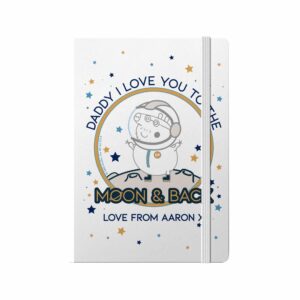 Add a special message of up to 25 characters to this Daddy Pig notebook! Your chosen message will feature below the image and fixed text ‘Daddy I love you to the moon & back.’ The white soft feel A5 Notebook with matching elastic closure band and internal bookmark ribbon, contains approximately 80 lined pages.