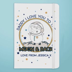 Add a special message of up to 25 characters to this Daddy Pig notebook! Your chosen message will feature below the image and fixed text ‘Daddy I love you to the moon & back.’ The white soft feel A5 Notebook with matching elastic closure band and internal bookmark ribbon, contains approximately 80 lined pages.
