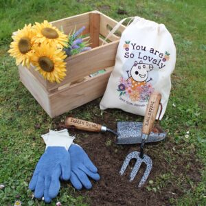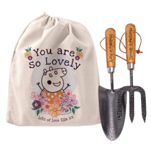 Personalise this Peppa Pig heavy-duty gardening tool set with a name using a maximum of 15 characters. The sturdy trowel and fork are produced by ‘Draper Tools’ and are made from quality carbon steel. They each feature lacquered ash handles which are finished off with handy wrist straps, both are engraved with your chosen name before the fixed Text ‘trowel’ and ‘fork’ for example ‘Mum’s Trowel’ and ‘Mum’s Fork’. You can also add a special message on the handy drawstring storage bag below the fixed text ‘you are so lovely’. Dimensions: Trowel: 32cm long, 8cm wide. Fork:29cm long, 7.5cm wide. Drawstring bag: 35 x 25cm