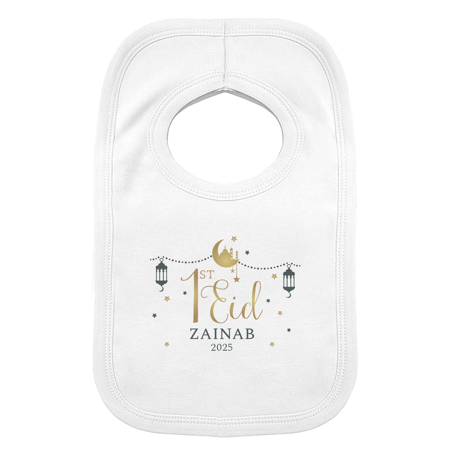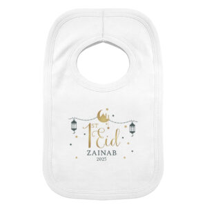 - The personalisation will appear in fixed uppercase. ‘1st Eid’ is fixed text and cannot be changed This 100% cotton baby bib is sized 0-3 months.