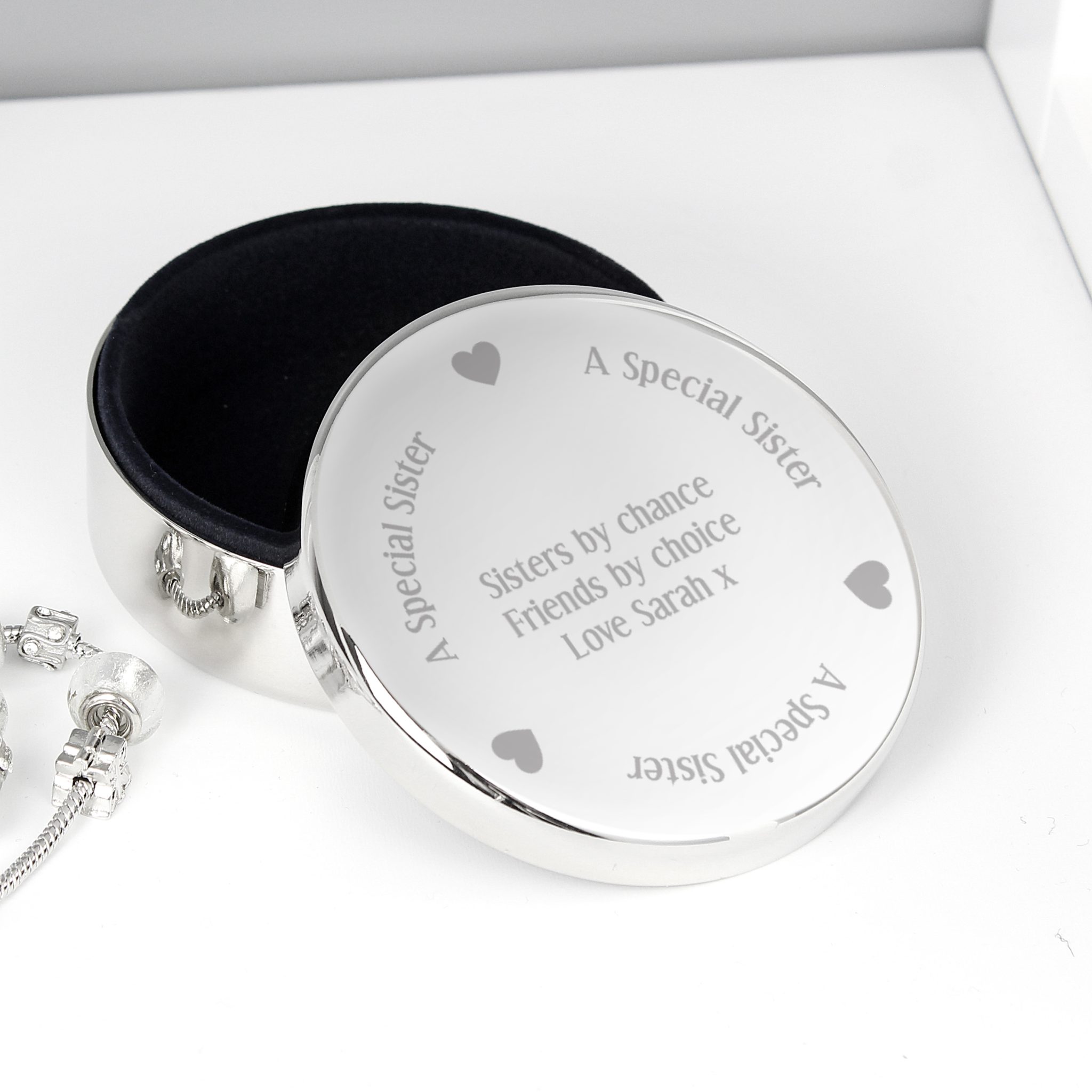 Personalise this Special Sister Round Trinket with 3 lines, up to 25 characters per line.