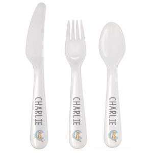 - This practical 3 piece set of plastic cutlery featuring the Animal Alphabet design can be personalised with any name up to 12 characters in length.