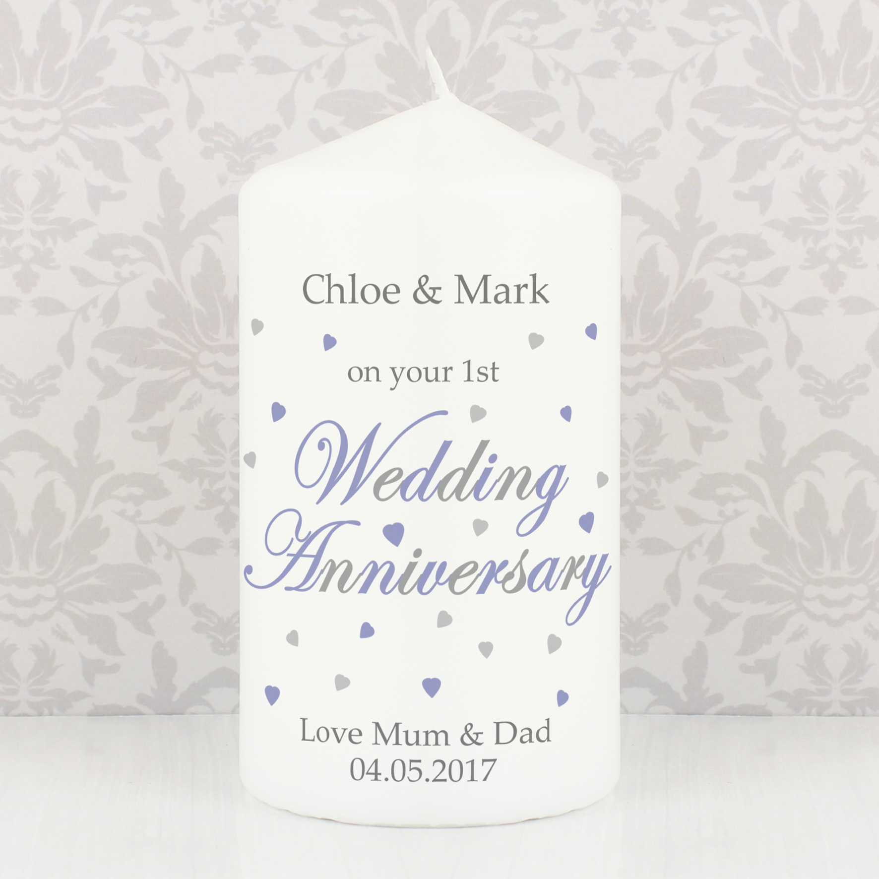 Personalise this Wedding Anniversary Candle with the couple’s surname or first names up to 30 characters, an anniversary up to 30 characters (e.g. 20th, 30th) and 2 lines of text with up to 30 characters per line at the bottom of the candle.