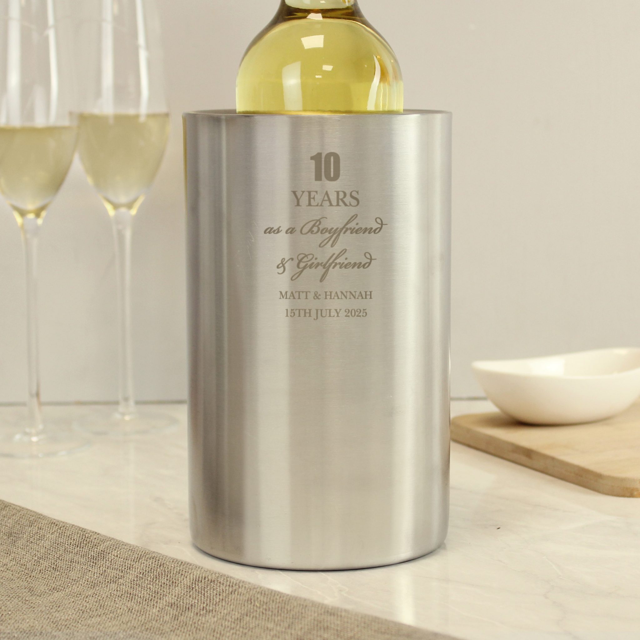 - Personalise this wine cooler with any message over 6 lines, Line one has a character limit of 2, perfect for the number of years together.