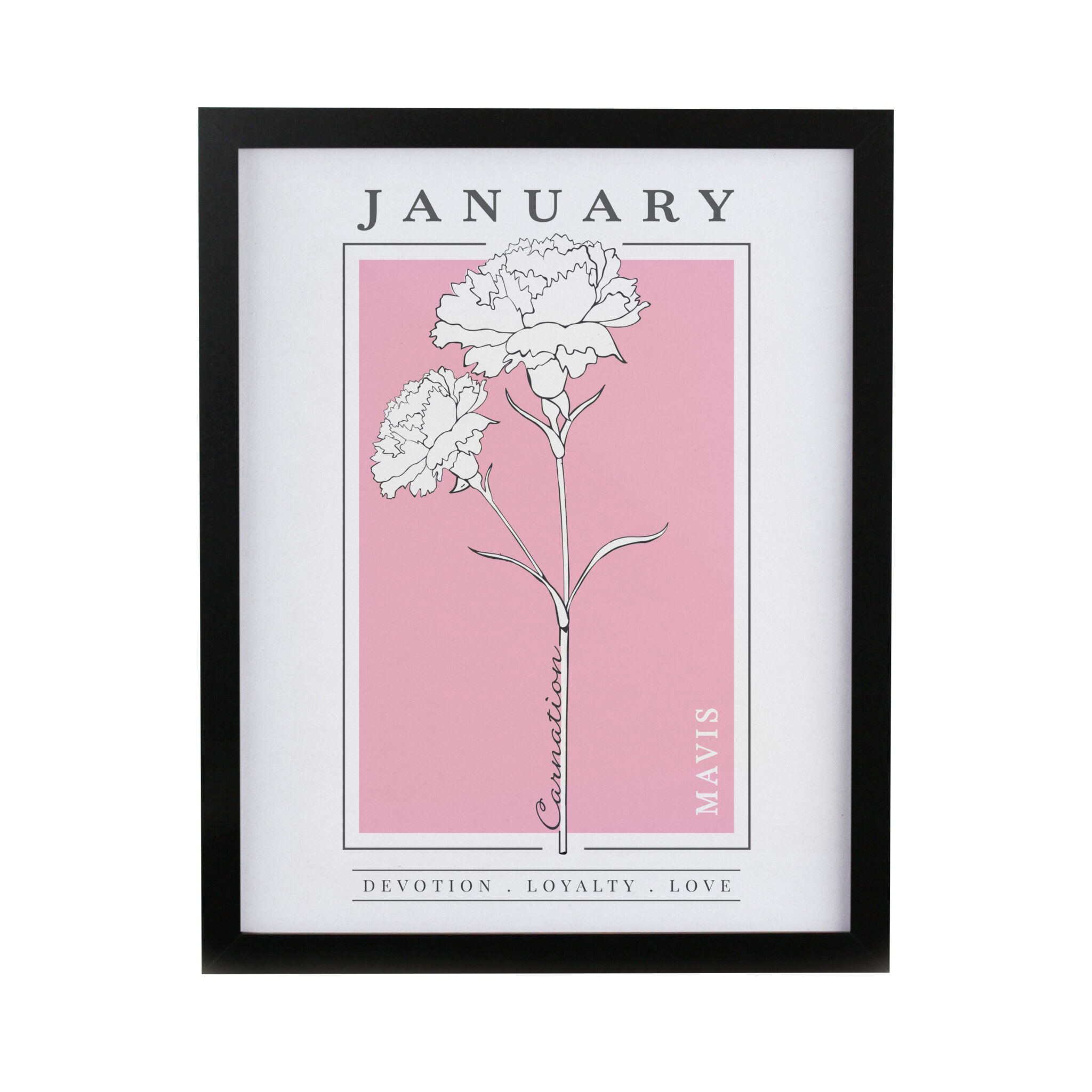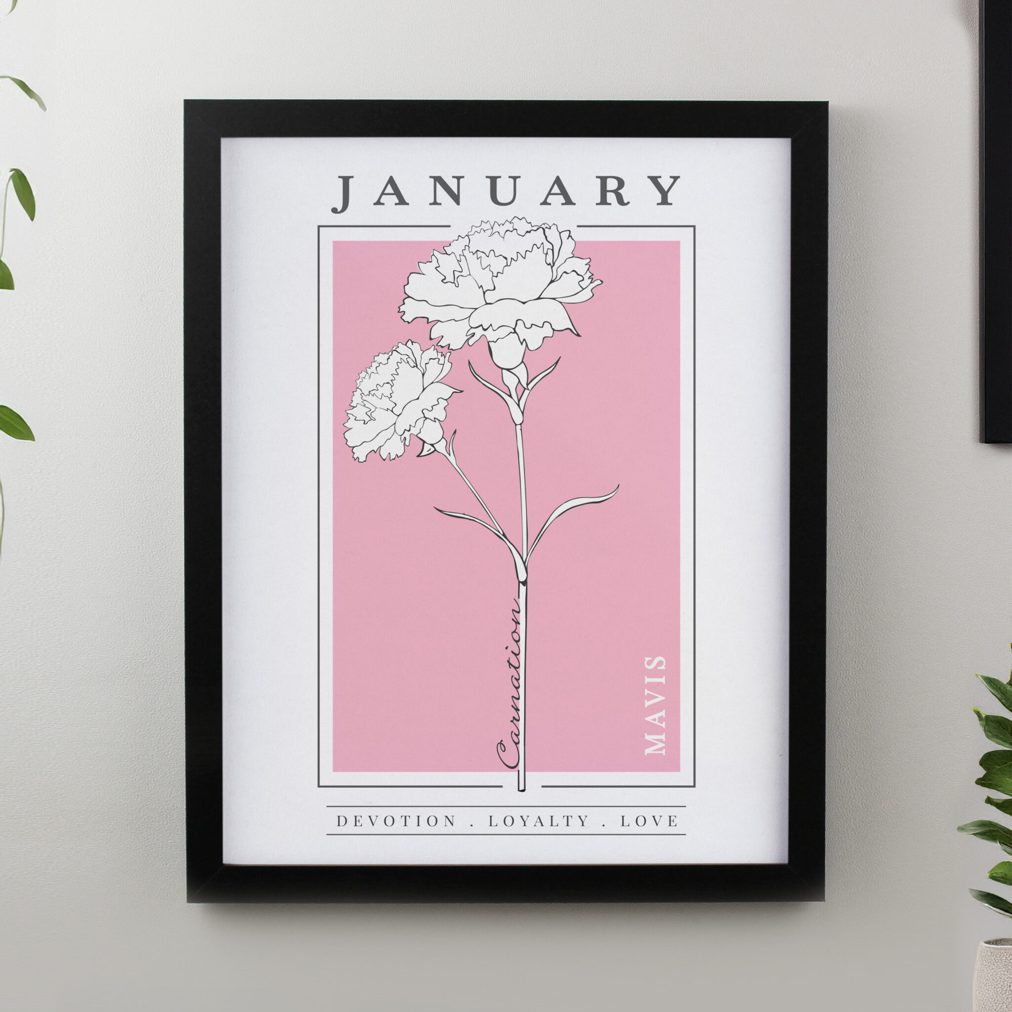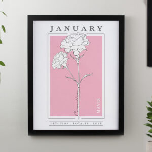 - All personalisation will appear in fixed UPPERCASE Please note, the name of the month and flower are fixed elements of the design and cannot be amended or removed To finish this stylish piece of art each print is framed in a large black frame. Please CLICK HERE to see the full range Ideal for any occasion.