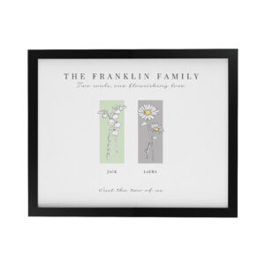 - This unique framed print can be personalised with 2 message lines along the top, 2 flowers below, each with a name underneath and finally a message underneath of up to 50 characters.