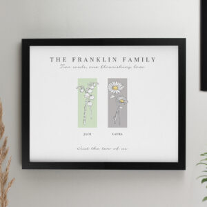 - This unique framed print can be personalised with 2 message lines along the top, 2 flowers below, each with a name underneath and finally a message underneath of up to 50 characters.