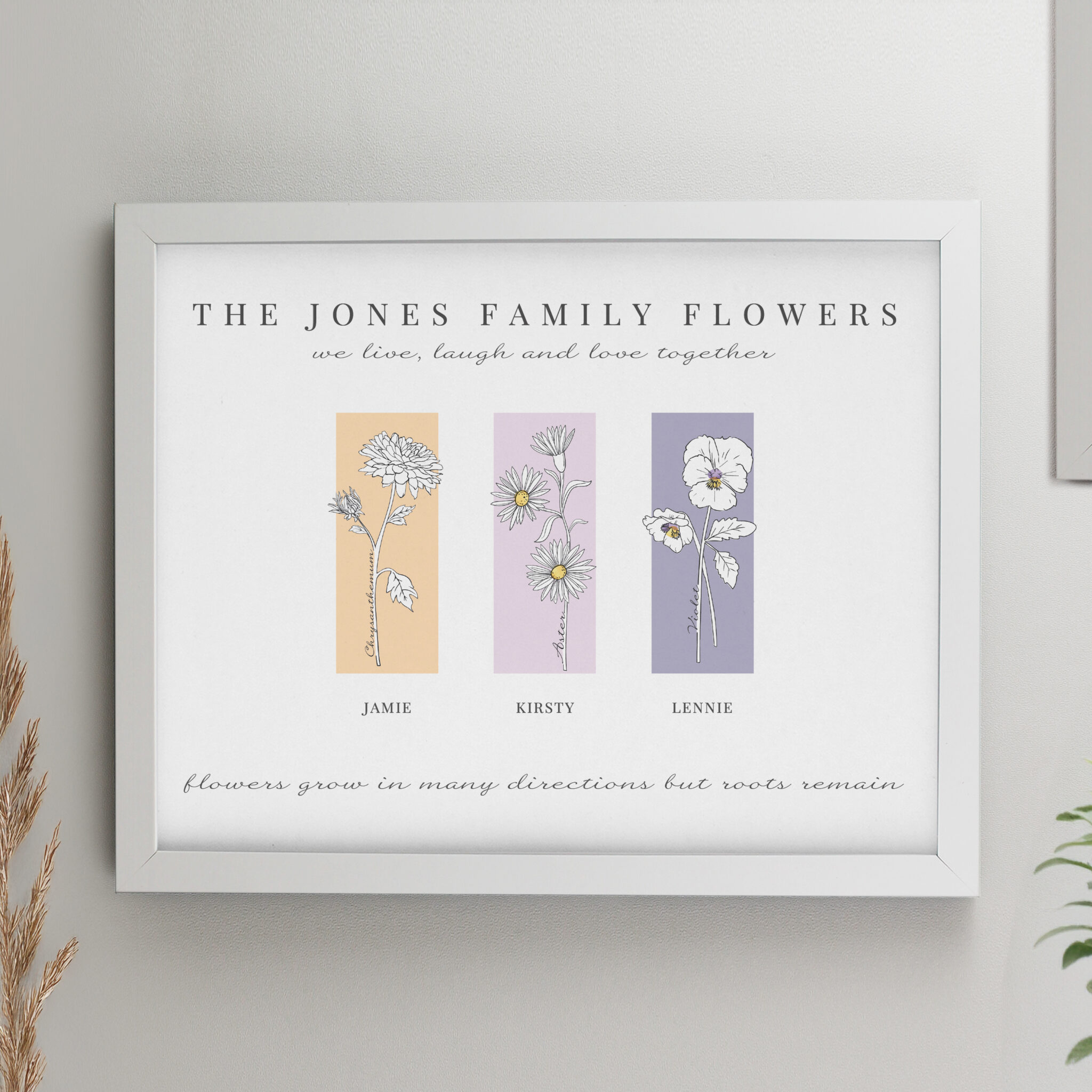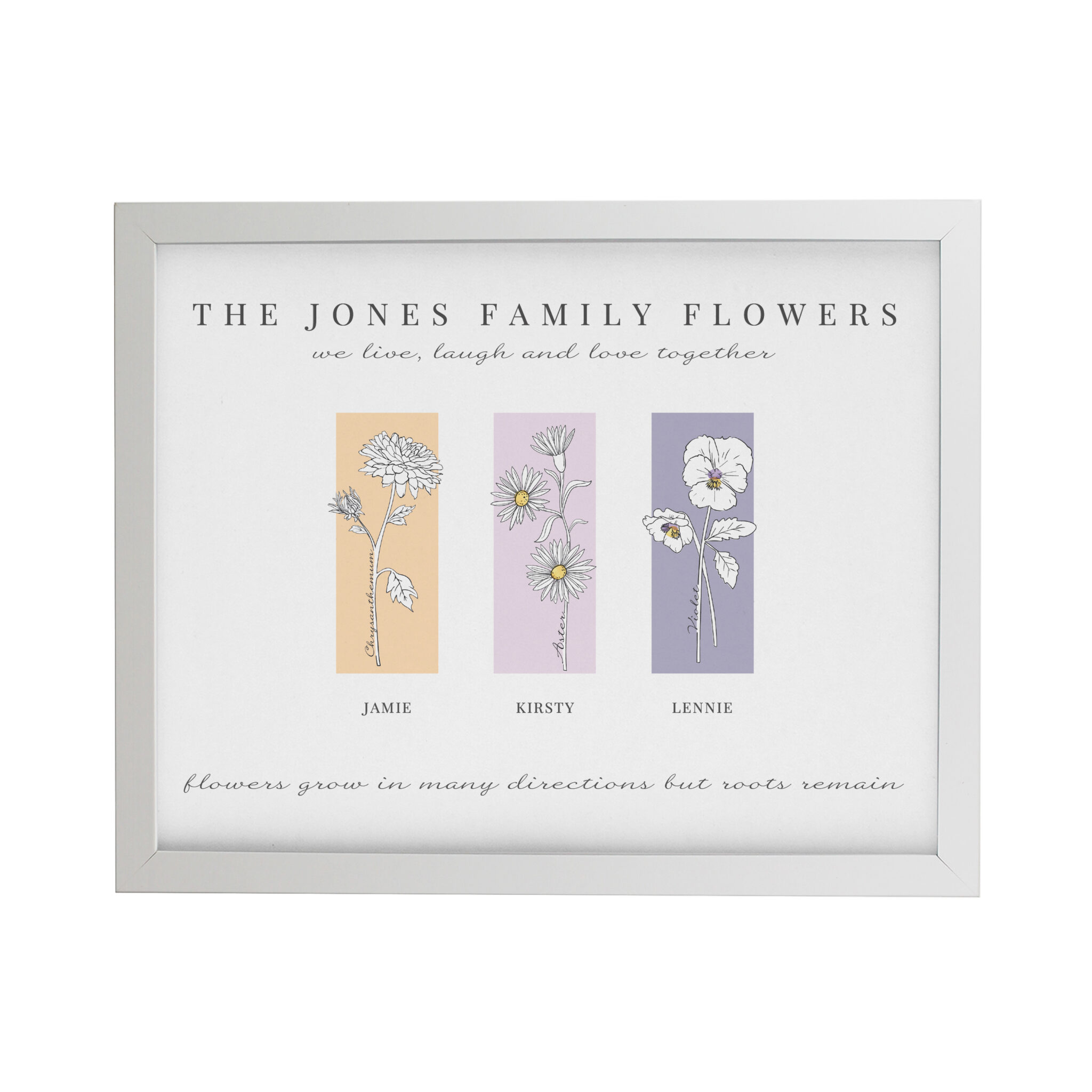 - This unique framed print can be personalised with 2 message lines along the top, 3 flowers below, each with a name underneath and finally a message underneath of up to 50 characters.