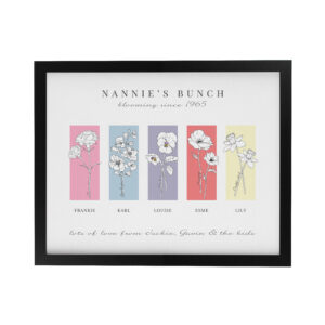 - This unique framed print can be personalised with 2 message lines along the top, 5 flowers below, each with a name underneath and finally a message underneath of up to 50 characters.