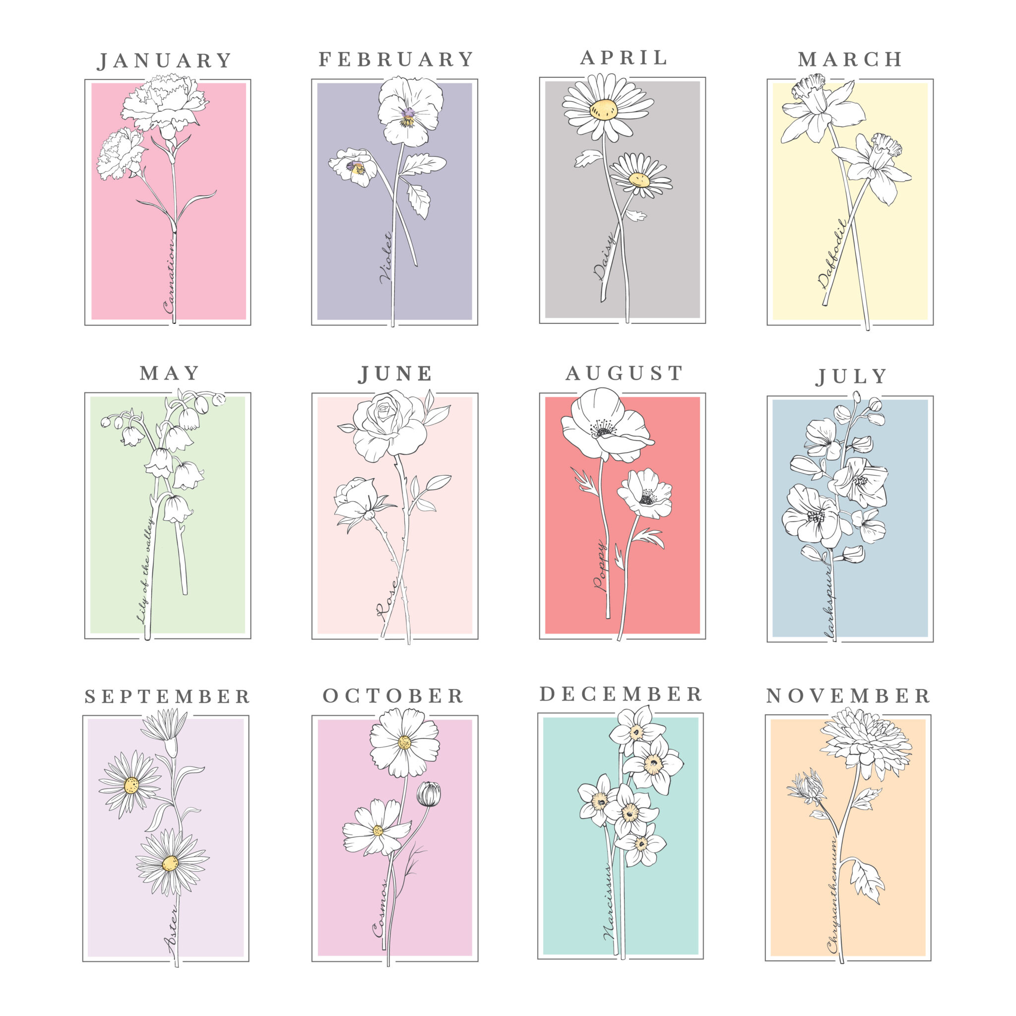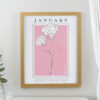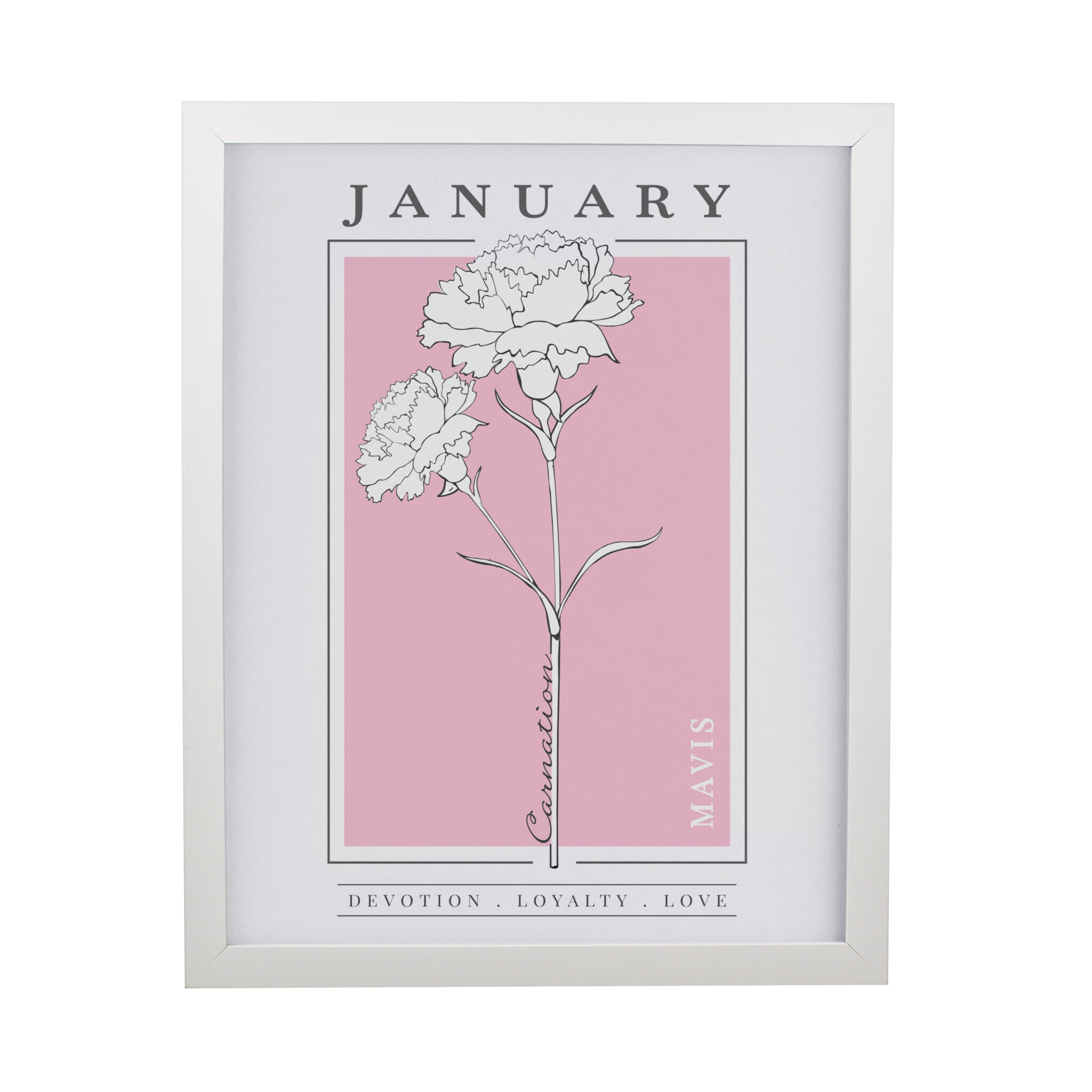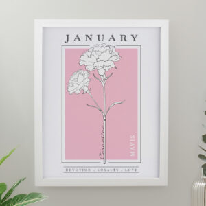 - All personalisation will appear in fixed UPPERCASE Please note, the name of the month and flower are fixed elements of the design and cannot be amended or removed To finish this stylish piece of art each print is framed in a large white frame. Please CLICK HERE to see the full range Ideal for any occasion.