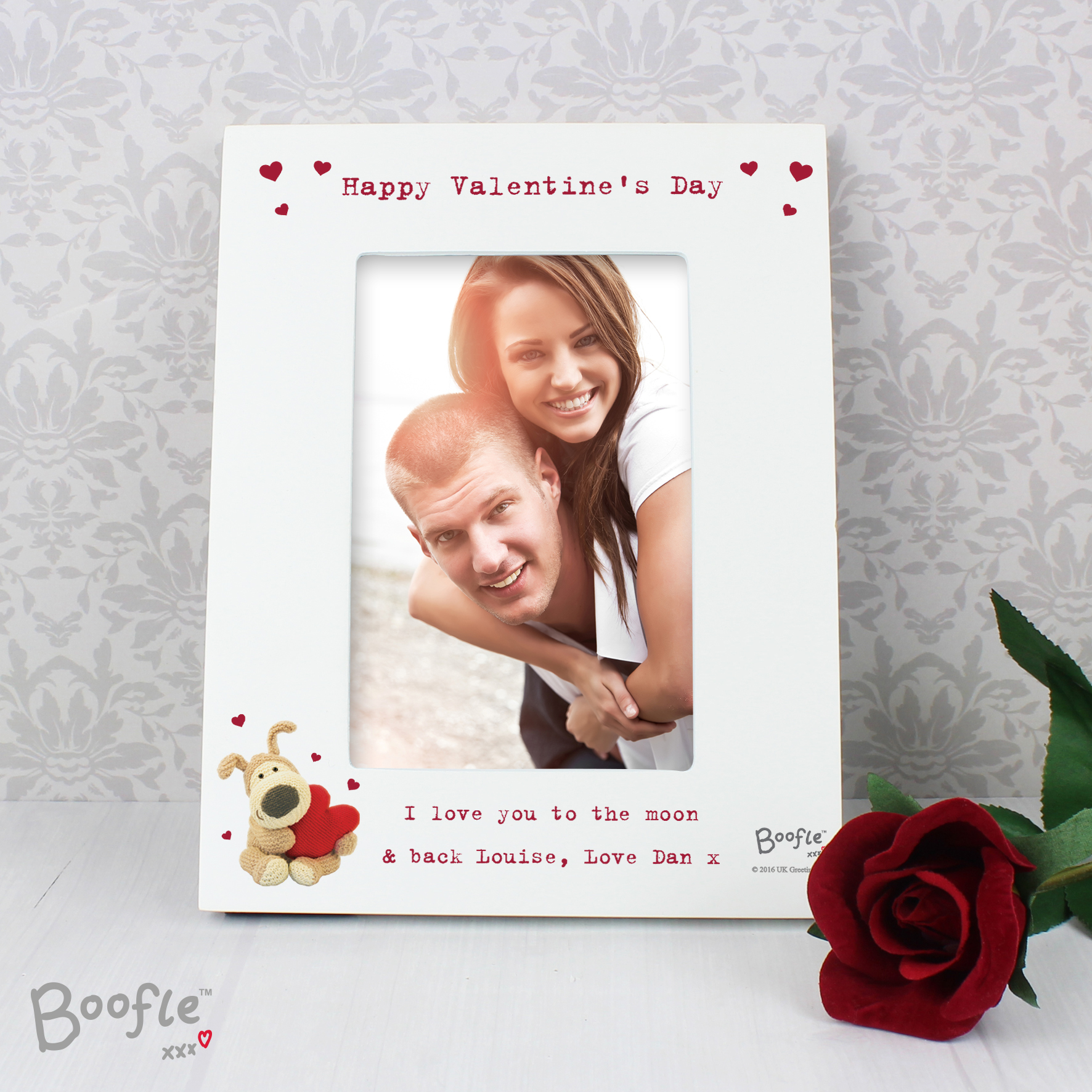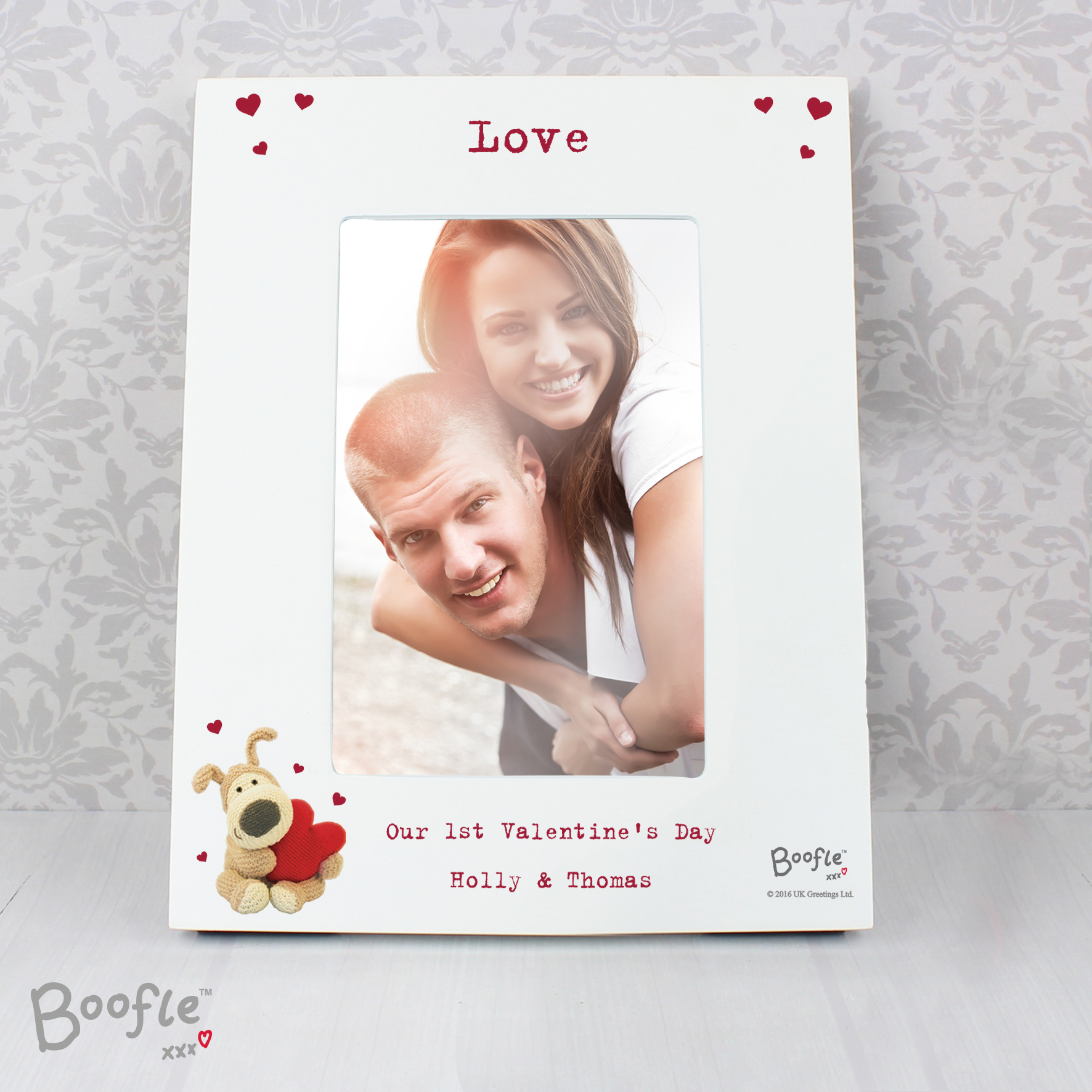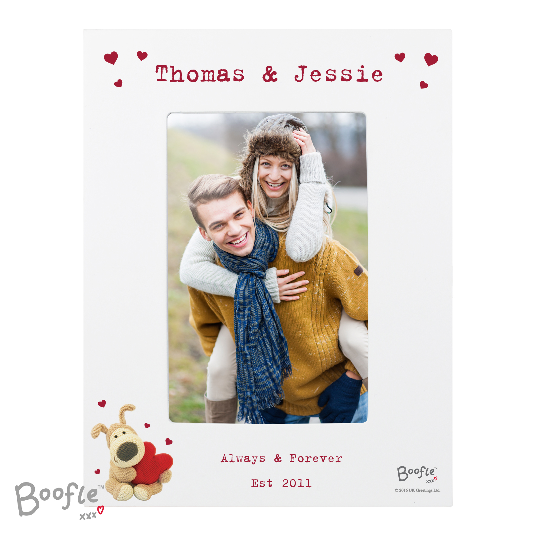 This Personalised Boofle Shared Heart 4×6 White Wooden Photo Frame is a great way of displaying the happy couples favourite photograph together.