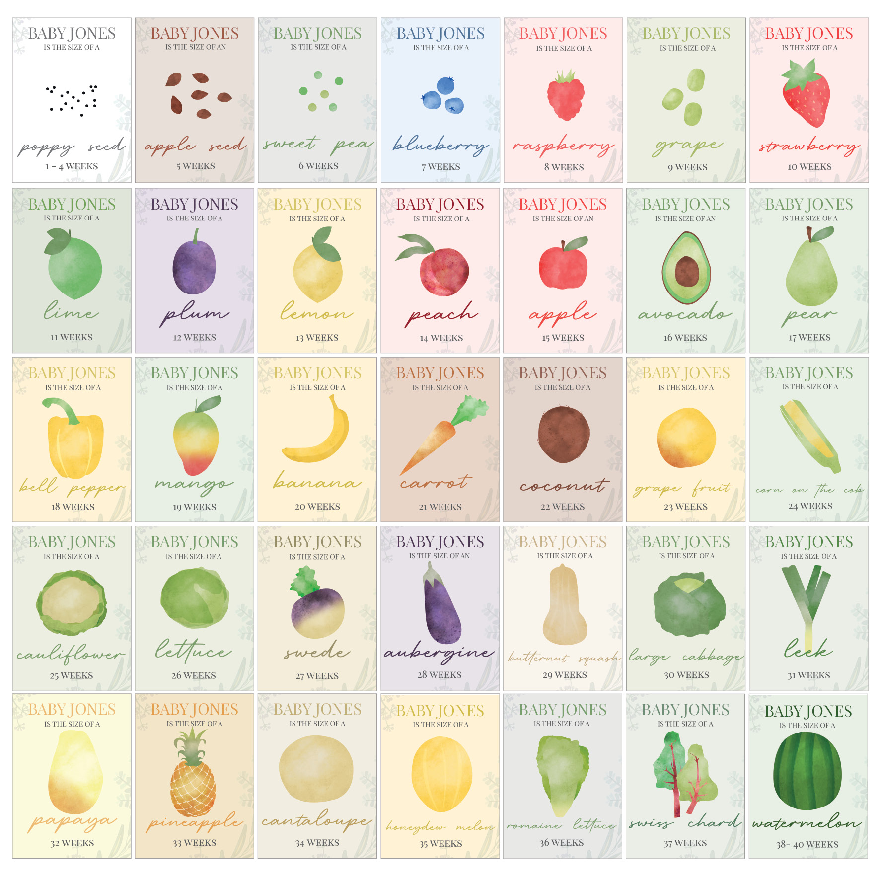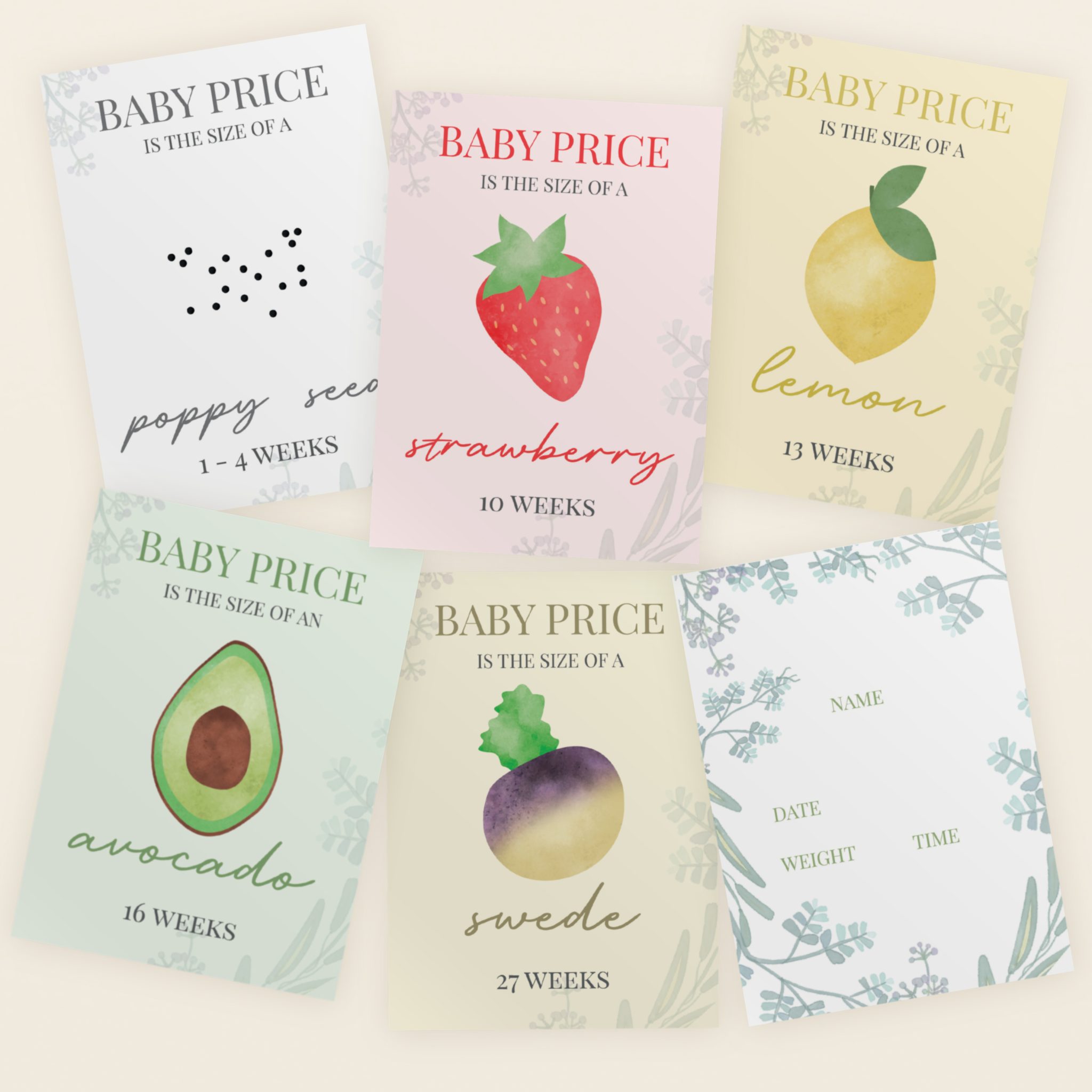 - Each card features a fruit or vegetable design to show how big you baby is at which stage.