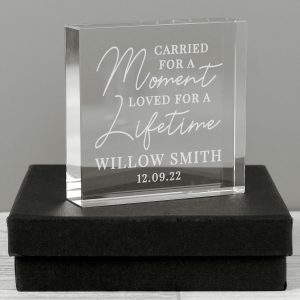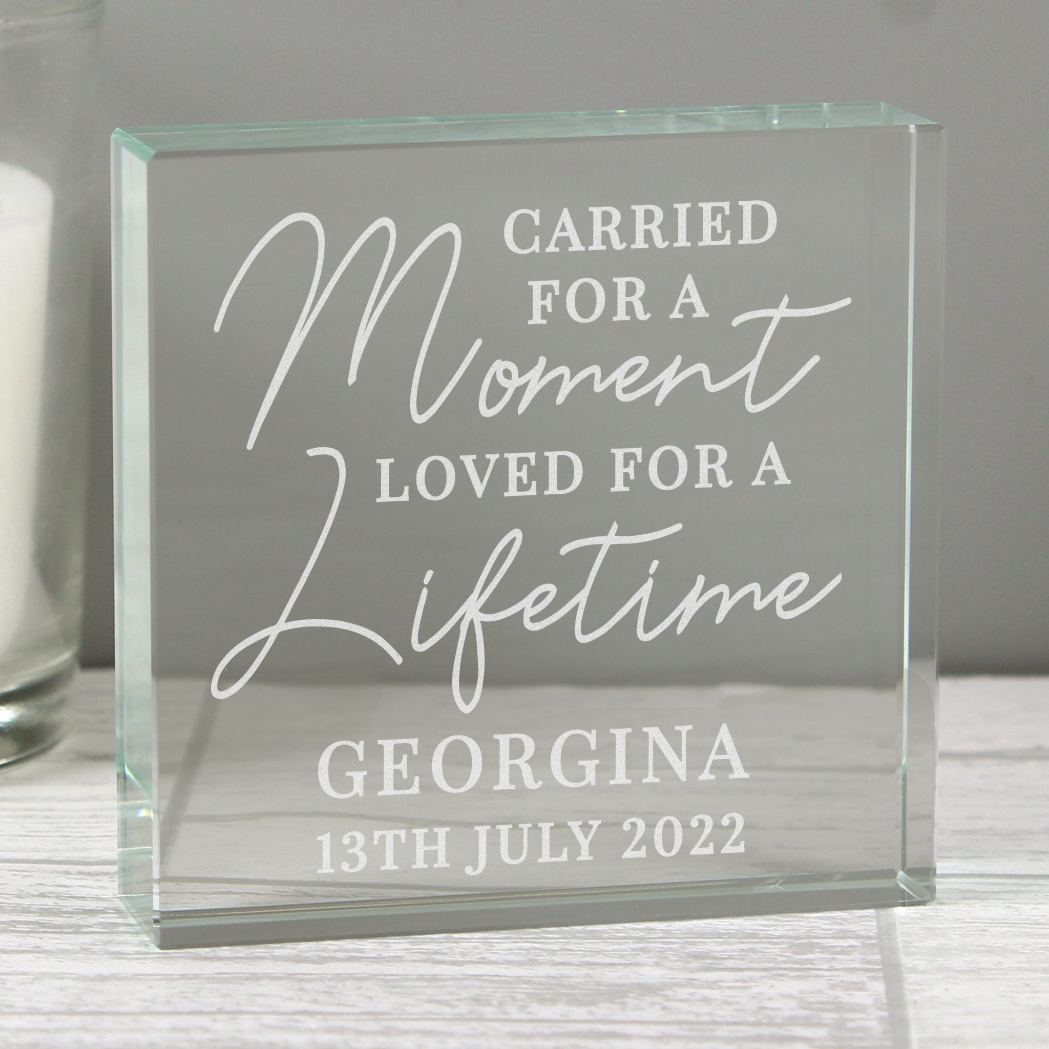 Line 1 is mandatory ‘Carried for a moment, loved for a lifetime’ is fixed text and cannot be changed. - All personalised text will appear in fixed upper case.