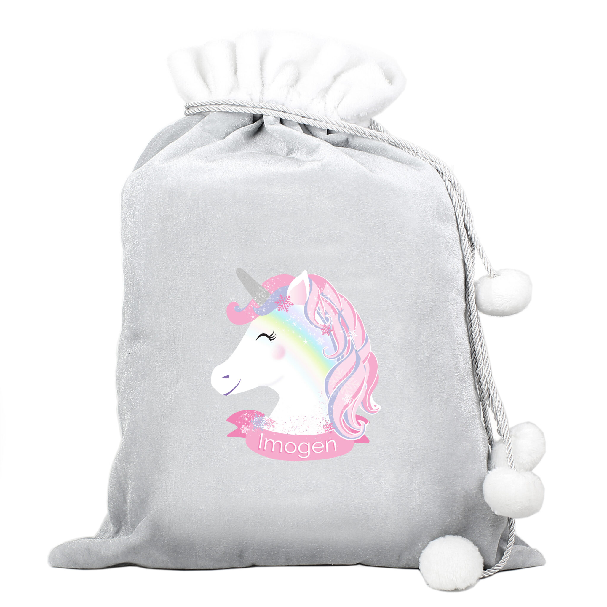 Be the first to review “Personalised Christmas Unicorn Luxury Silver Grey Pom Pom Sack” Cancel reply