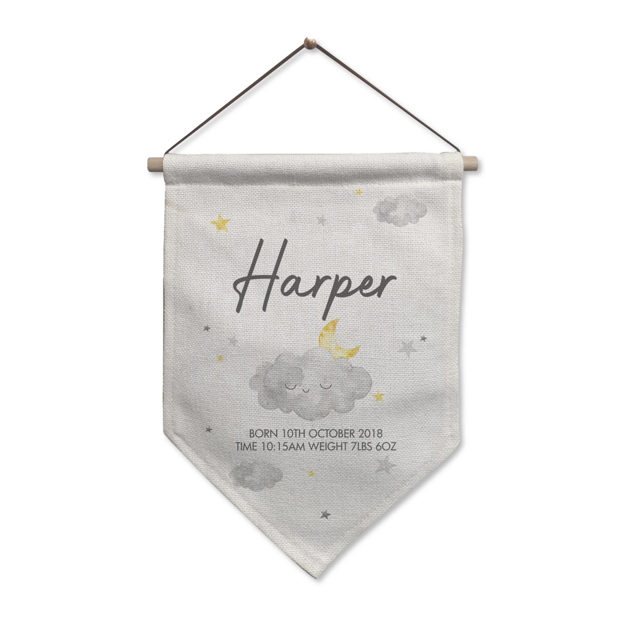 Personalise this sweet linen hanging banner with a name up to 12 characters long above the cloud and a special message below over 2 lines of 30 characters.