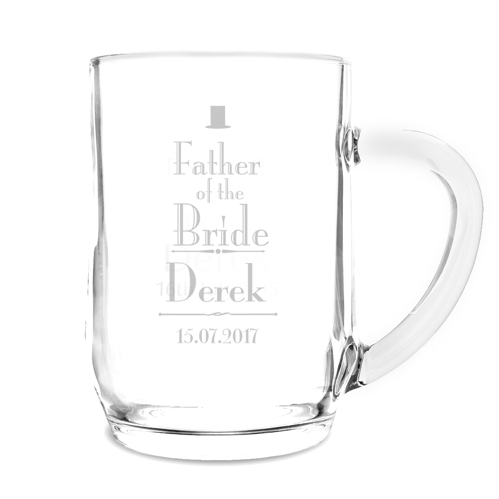 Personalise this Decorative Wedding Father of the Bride Glass Tankard with a name up to 12 characters and a date up to 15 characters.