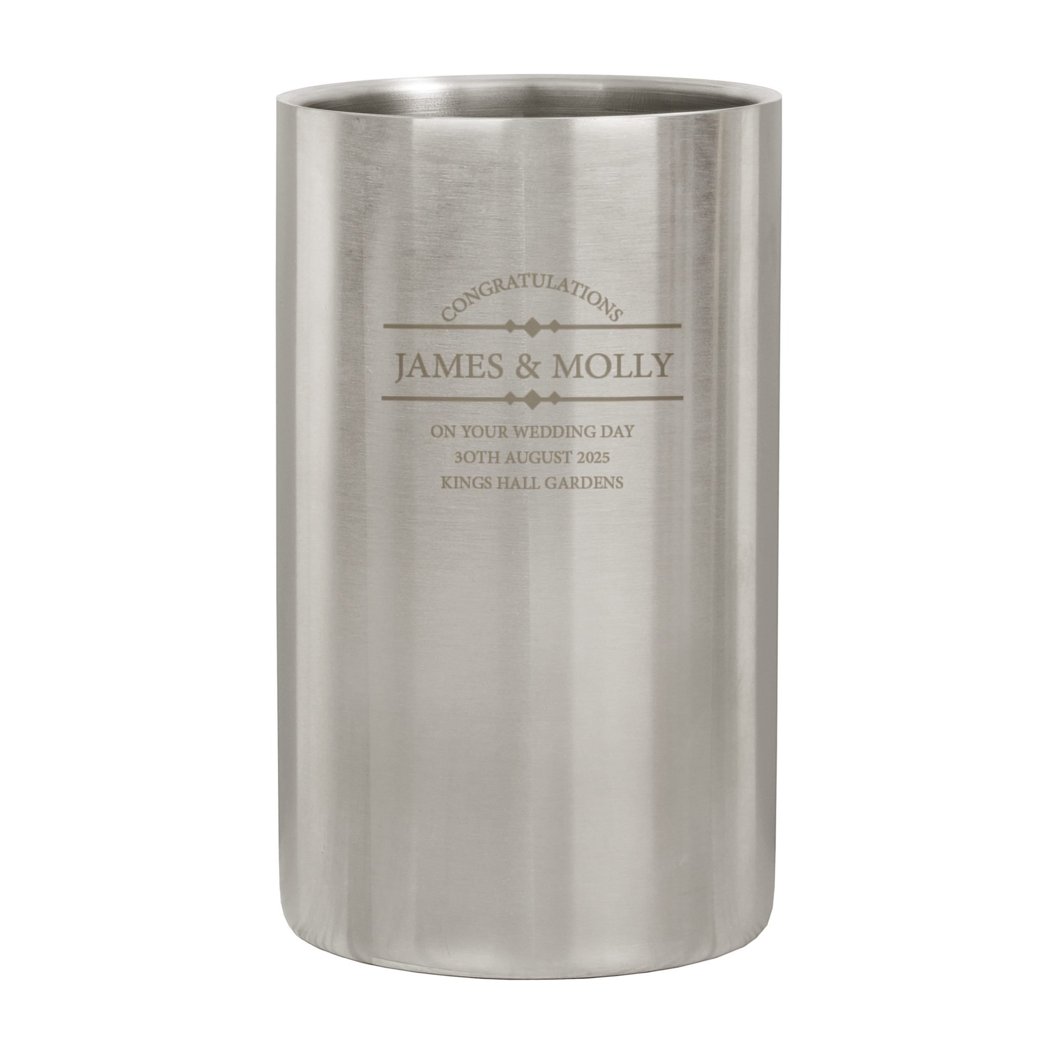- Personalise this Diamond Stainless Steel Wine Cooler 1 line of text up to 15 characters (to appear at the top), 1 line of text up to 20 characters (appears in BOLD) and an additional 3 lines of text up to 30 characters.