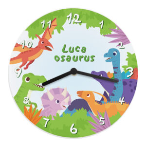 - This beautifully crafted clock features our bright coloured Dinosaur design, perfect for little ones!