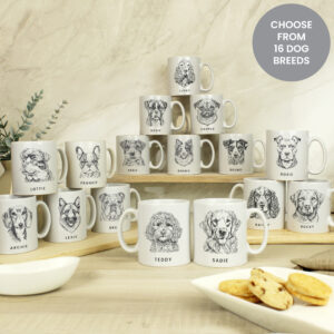 - This beautifully crafted mug showcases an adorable illustration of your chosen breed on the front, along with your dog’s name for that extra personal touch.